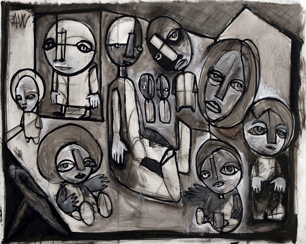 Risulterà evidente che, il dato che accomuna la matrice creativa dei due artisti è l’attenzione sensibile ed intelligente che entrambi rivolgono alla verità, o per meglio dire, alla propria verità rispetto all’esperienza della vita che si muove per Uberti sull’asse uomo-storia-coscienza-spiritualità, per Bucchi sul filo della realtà sociale e del tratto che congiunge l’interiorità di uno spirito sensibile alla complessa, poliedrica e contraddittoria realtà sociale di cui diviene consapevole portavoce. Dal punto di vista tecnico le strade percorse dagli artisti trovano livelli di interazione con la tela visibilmente diversi: il discorso pittorico di Uberti parte dalla profondità della tela, pervadendola poi in tutte le sue dimensioni percettibili in una stratificazione di piani ideali ed effondendo il proprio fluire verso il primo piano della tela che assorbita dalla materia pittorica ne diviene quasi “oggetto” strumentale, esplicitando il dialogo sempre ferrato nella produzione dell’artista tra scultura e pittura. Al contrario Danilo Bucchi colloquia con il primo piano della tela utilizzando il supporto come pagina bianca su cui scrivere il proprio discorso pittorico che si intesse in rilievo, su quel primissimo piano che impressiona lo sguardo e capta l’attenzione sul segno, quasi un’ elevazione del tono della voce artistica rispetto alla corrente, superficiale, indifferenza.