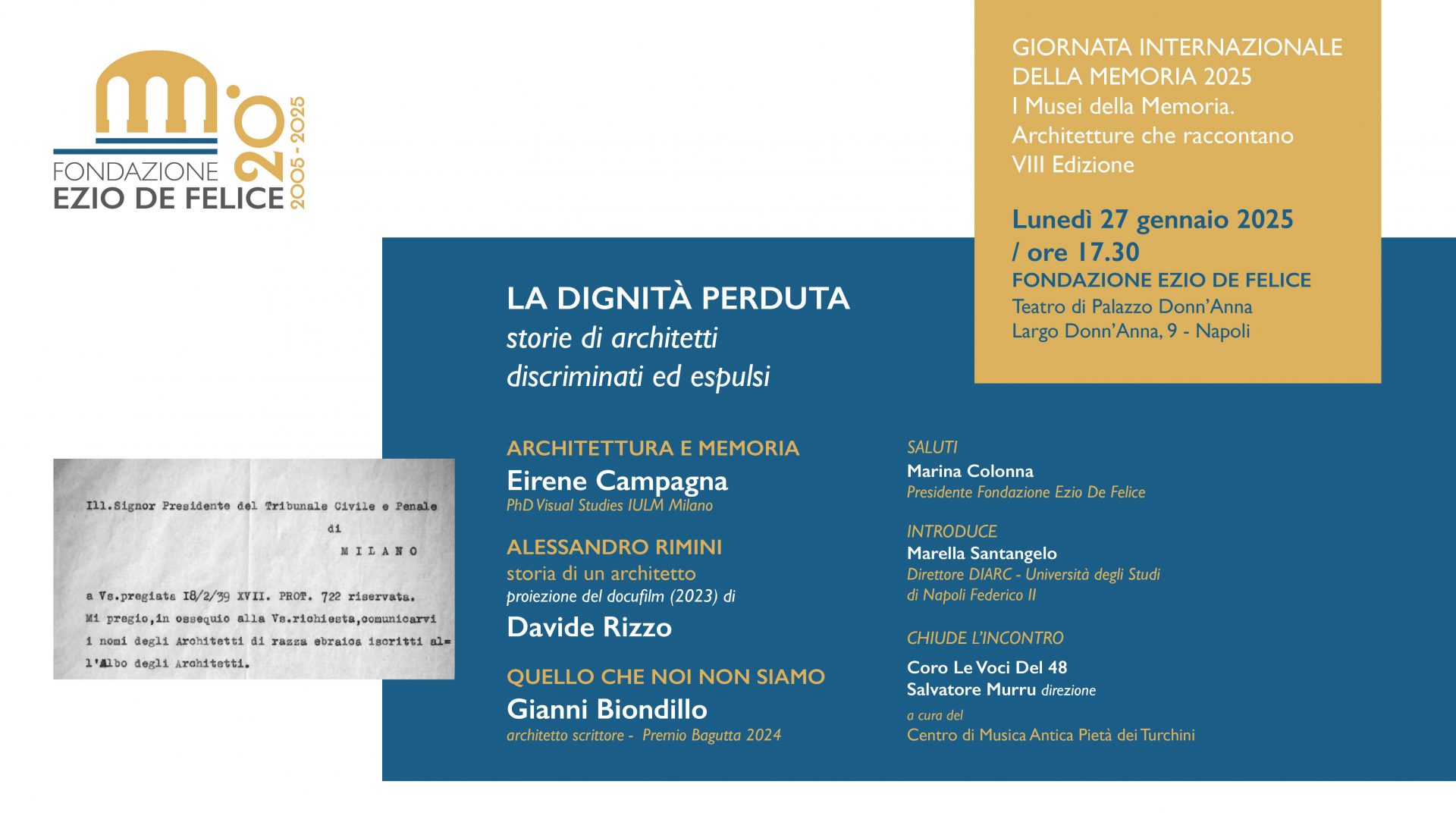 In occasione della Giornata Internazionale della Memoria, lunedì 27 gennaio alle ore 17.30, a Palazzo Donn’Anna la Fondazione Ezio De Felice, per l’ottava edizione della rassegna “I Musei della Memoria, architetture che raccontano”, presenta l’evento dal titolo “La dignità perduta, storie di architetti discriminati ed espulsi”.
