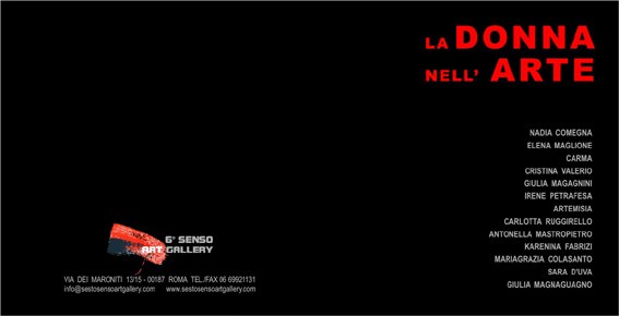 6° Senso Art Gallery è lieta di invitarLa all’inaugurazione della mostra La donna nell’arte, giovedì 23 settembre 2010 alle ore 18.30. Questa mostra tutta al femminile, patrocinata dalla Consigliera di Parità della Regione Molise Giuditta Lembo, dalla Presidenza del Consiglio Regionale del Molise e da Sprint Molise è innanzitutto un omaggio alla donna e alla sua femminilità ma anche al suo mondo misterioso e introspettivo. Le artiste (Nadia Comegna, Elena Maglione, Carma, Cristina Valerio, Giulia Magagnini, Irene Petrafesa, Artemisia, Carlotta Ruggirello, Antonella Mastropietro, Karenina Fabrizzi, Mariagrazia Colasanto, Sara D’Uva, Giulia Magnaguagno), per la maggior parte molisane, raccontano attraverso molteplici linguaggi artistici: dalla pittura alla fotografia fino all'artigianato,il loro mondo nel quale traspare al fondo una dichiarazione etica.
