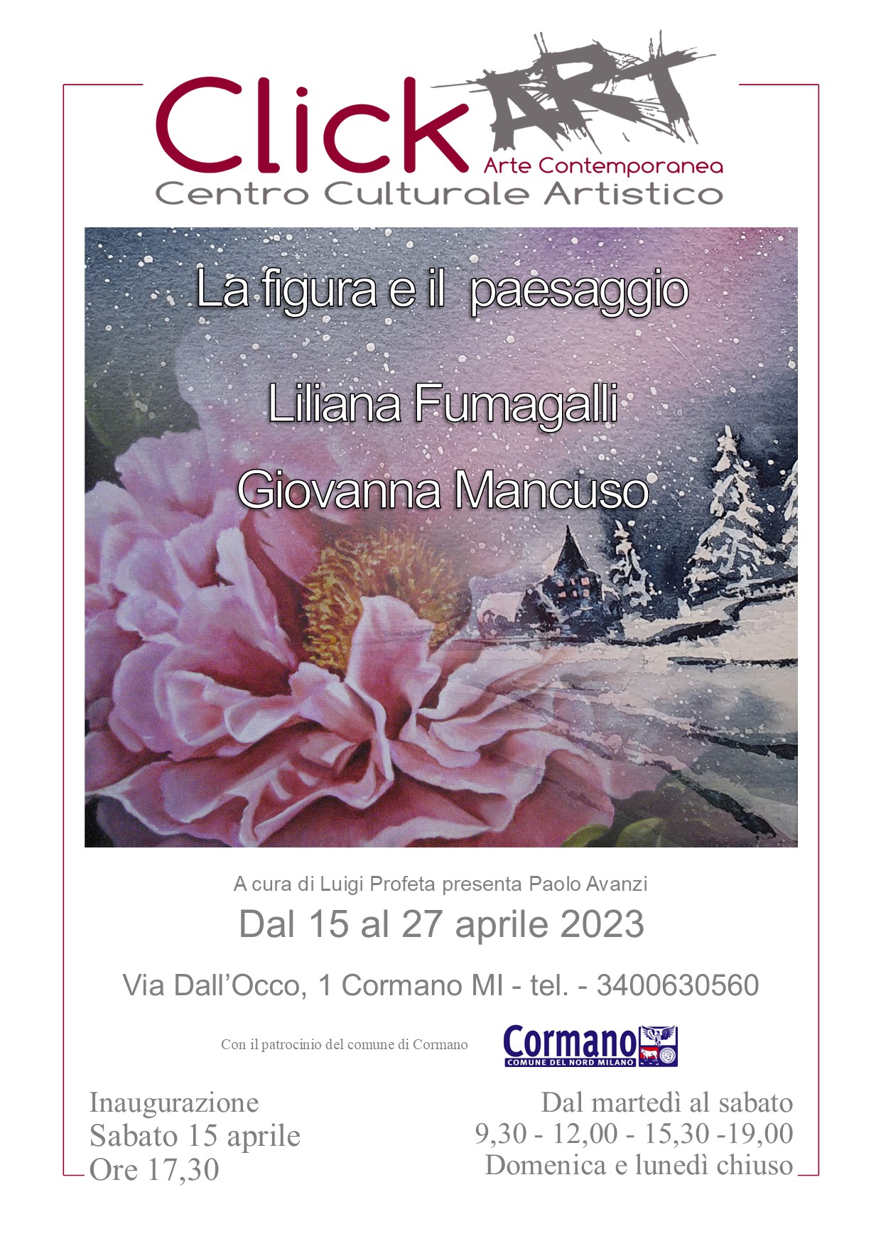 In esposizione al Centro Culturale Click Art le opere figurative di due artiste che hanno saputo lasciare un segno tangibile della propria personalità grazie a indiscutibili sensibilità e talento.Le opere esposte in questa doppia personale rivelano due prospettive complementari dellarealtà. Quella di Giovanna Mancuso è una visione di insieme che predilige il paesaggio, sia urbano sia naturalistico, caratterizzato da atmosfere ovattate e dense di un fascino antico. La pittura di Liliana Fumagalli è focalizzata invece sul ritratto, in forma intimistica ed espressiva, esaltandone la dimensione emozionale che viene espressa grazie ad uno spiccato acume psicologico.In Giovanna Mancuso l'apparente semplicità dei paesaggi di carattere naturalistico o urbano lasciano trapelare atmosfere misteriose che coinvolgono l'osservatore in un rapporto profondo e vitale, dove la realtà stessa si fonde con la fantasia. Le opere di questa artista hanno il fascino di una semplicità d'altri tempi, fatta di dettagli e sfumature frutto di uno studio accurato e meticoloso. Una precisione che scende così in profondità da cogliere la storia che sta dietro all'immagine di un fiore così come di un paesaggio.Ed è proprio questa capacità di scandagliare retrospettivamente la realtà che rende inconfondibile questa artista. Il segno del pennello, intriso di colore e intinto nell'acqua,non è un semplice tratto, ma un elemento di una plastica costruzione immaginariache l'artista colloca sulla carta, dove la "terza dimensione" non è la larghezza o lospessore, ma ciò che è accaduto. Una dimensione temporale quindi che corrobora lavisione del presente.Questo lo si percepisce in tante "cartoline" di paesi o scorci dipaesaggi dove la rappresentazione è talmente nitida e sapiente che viene naturale immergersi nell'atmosfera da cui tali immagini sono scaturite. Ma sappiamo che nulla è immutabile nella realtà. E' così che un papavero, un faro o un vecchio tram diventano metafora di un prezioso mondo da preservare, almeno sulla carta, prima che sia troppo tardi.Le opere figurative di Liliana Fumagalli rappresentano uno straordinario connubio di sensibilità e perizia tecnica. I volti che questa artista raffigura vanno ben al di là del