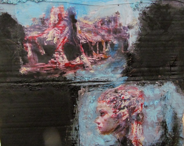 Quindi, l’Artista Michele Principato Trosso, oltre ad analizzare fatti e storia, s’interroga e ci interroga, se il filo conduttore delle opere proposte, lo abbiamo percepito e condiviso, oppure no, perché ritenuta una opinione personale dell’Artista, legata alla sua personale formazione culturale; allora, ecco che le opere, rispetto ad un Principato Trosso, materico coloristicamente, astratto, formale (Il ciclo dei Tronchi) e anche formale astratto, o informale astratto, ecco che unisce, il suo primitivo stile, con accenni di “figurativo didascalico”, che unito, amalgamato e presente nella parte astratta, ecco che viene reso diafano, presente e assente, visibile, o appena percettibile, oppure reso come una visione subacquea, di un mondo sommerso, il tutto, comunque, perfettamente coerente, coordinato, armonioso.