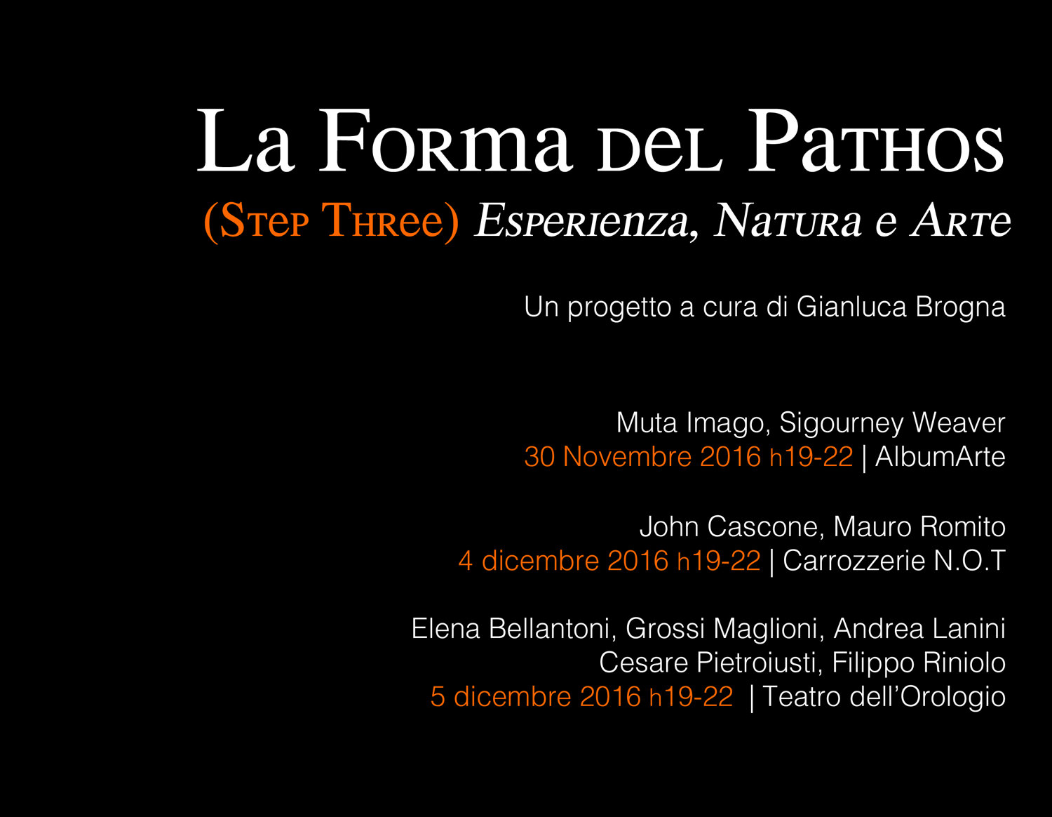 Per il suo terzo appuntamento il progetto ‘La Forma del Pathos’ attraversa i confini del Teatro dell’Orologio e segna un nuovo percorso di collaborazione con lo spazio no profit dedicato alle arti visive contemporanee AlbumArte e lo spazio di ricerca teatrale Carrozzerie N.O.T.