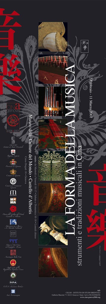 Dopo “La via della scrittura” a Palazzo Ducale, “Ombre elettriche. Manifesti per il cinema cinese 1934-2006” al Palazzo della Provincia, “Le pietre delle meraviglie” all’Istituto di Studi Orientali, “Cina perduta. Immagini ed opere di un impero remoto” al Museo di Palazzo Rosso è ora la volta della musica e degli strumenti musicali della tradizione cinese in mostra al Museo delle Culture del Mondo Castello d’Albertis dal 2 Febbraio all’11 Marzo 2007.
