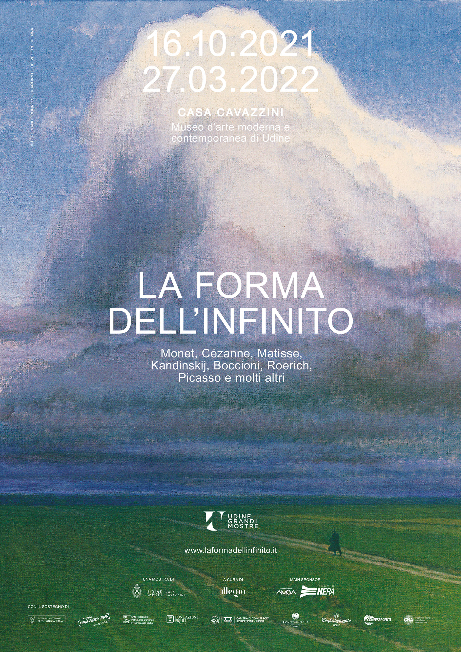 La mostra «La forma dell’infinito» intende dare al visitatore la percezione d’essere il destinatario di una rivelazione suggestiva, con opere che facciano sfiorare l’infinito. Basti pensare alle firme dei cinquanta capolavori, molte delle quali appartengono ai più importanti protagonisti dell’arte negli ultimi due secoli: Claude Monet, Paul Cézanne, Alfred Sisley, Henri Matisse, Dante Gabriele Rossetti, Michail Nesterov, František Kupka, Vasilij Kandinskij, Aristarch Lentulov, Natal’ja Gončarova, Odilon Redon, Maurice Denis, Jacek Malczewski, Mikalojus Čiurlionis, Nikolaj Rerich, Medardo Rosso, Umberto Boccioni, Pablo Picasso, Emilio Vedova, Ernst Fuchs, Hans Hartung e altri ancora. Mai Udine ha visto tanti giganti del bello darsi convegno in una mostra che smuove opere da nove paesi d’Europa, collegando la città friulana con straordinarie capitali culturali, tra cui Parigi, Londra, Vienna, Barcelona, Praga, Mosca, insieme ad altre e a diverse sedi italiane. La bellezza del progetto e dell’idea di fondo della mostra – tracciare una strada d’arte verso l’infinito – ha convinto a concedere prestiti estremamente pregiati musei illustri e collezioni più piccole ma importanti, pubbliche e private, che già denotano la levatura dell’esposizione: nell’elenco dei prestatori, Udine può rallegrarsi della collaborazione, fra gli altri, del Belvedere di Vienna, della collezione Peggy Guggenheim di Venezia e della Fondazione Solomon R. Guggenheim di New York, ma anche della Galleria Nazionale di Arte Moderna di Roma o del MART di Rovereto, della Galleria Tretyakov di Mosca e del Museu Picasso di Barcelona.