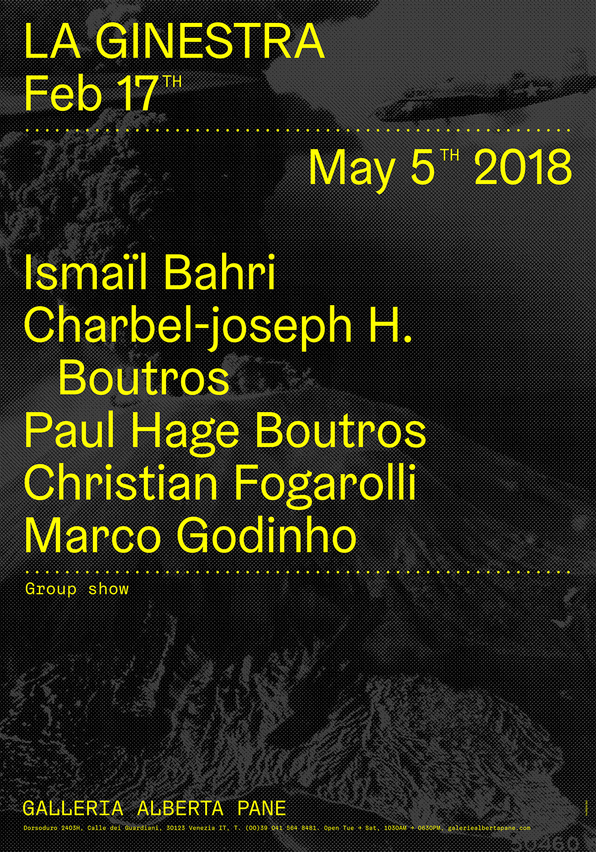 La Galleria Alberta Pane è lieta di presentare, per la sua terza mostra nello spazio espositivo veneziano, una collettiva che vede protagonisti cinque artisti di rilievo internazionale: Ismaïl Bahri (Tunisia, 1978), Charbel-joseph H. Boutros (Libano, 1981), Paul Hage Boutros (Libano, 1982), Christian Fogarolli (Italia, 1983) e Marco Godinho (Portogallo, 1978).