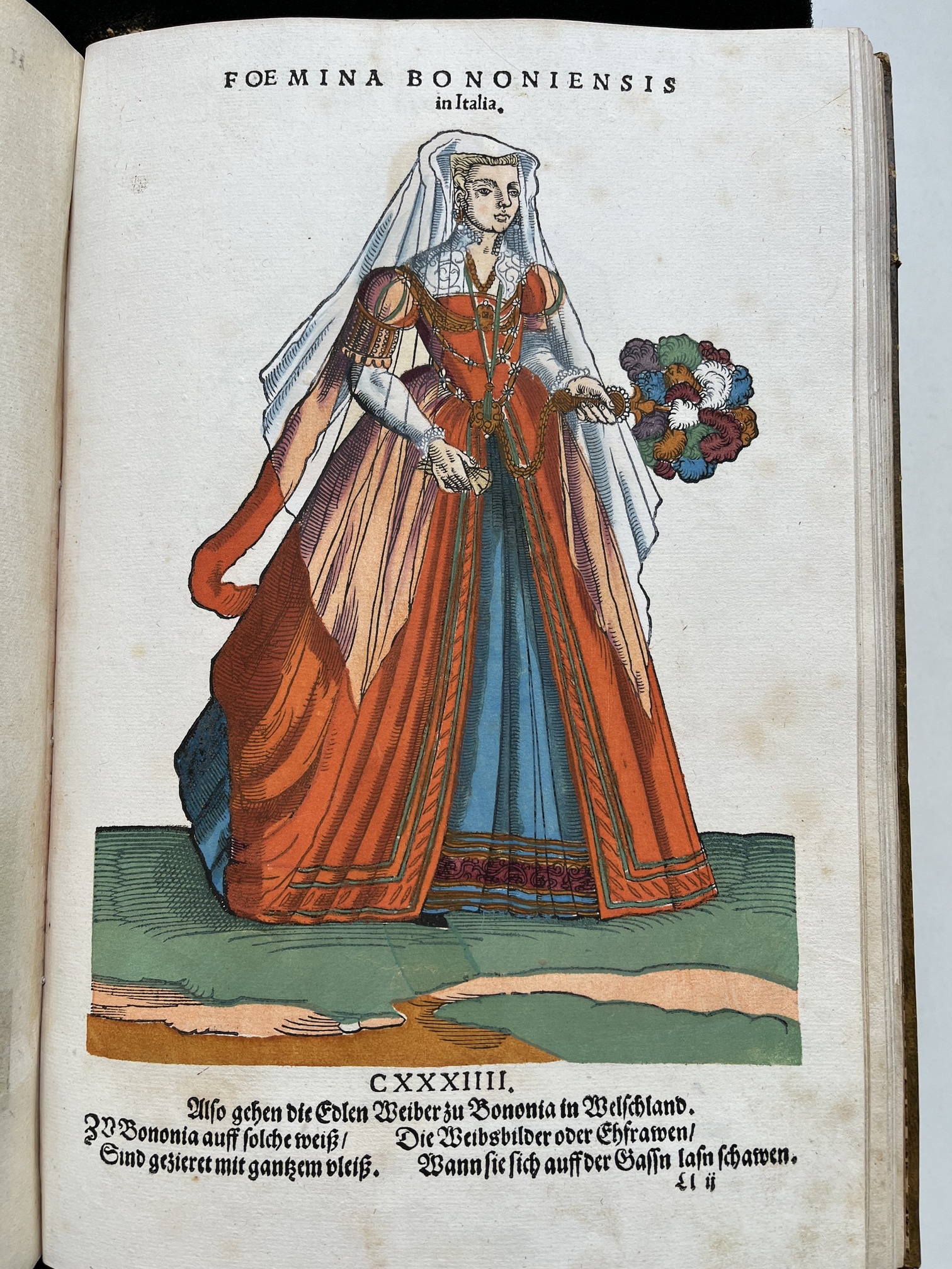 La sezione dell’esposizione presso la Sala Manoscritti curata dalla dott.ssa Saveria Rito, presenta alcuni dei più celebri trattati cinquecenteschi su abiti e costumi, corredati da illustrazioni magistralmente incise in xilografia (Cesare Vecellio) o in calcografia (Pietro Bertelli) e arricchiti da parti mobili che celano curiosi dettagli, fino a giungere alla monumentale opera di Giulio Ferrario (Il costume antico e moderno di tutti i popoli, 1826-1834) in 21 volumi impreziositi da oltre mille litografie a colori. Si aggiungono altre raffinate edizioni che esaltano l’eccellenza dell’arte italiana del ricamo stampate tra il XVI e il XVII secolo. Vera e propria rarità, infine, il trattato del modenese Giovanni Guerra dedicato alle Varie acconciature di teste usate da nobilissime dame in diverse città di d’Italia (non prima del 1589) costituito da eleganti incisioni in rame che raffigurano pettinature in uso in varie città.