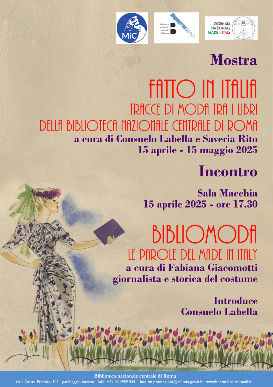 La Biblioteca nazionale centrale di Roma del Ministero della Cultura partecipa alla Giornata Nazionale del Made in Italy organizzata dal Ministero delle Imprese e del Made in Italy, con una mostra dal titolo Fatto in Italia: tracce di moda tra i libri della Biblioteca nazionale centrale di Roma.