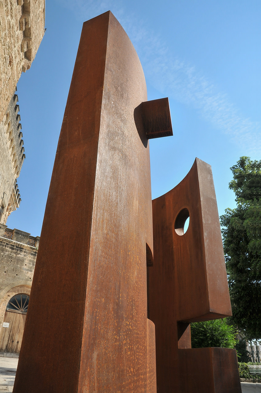 Originario di Nardò, in provincia di Lecce, l’artista ama la luce e con essa ci gioca, stuzzicandola e catturandola per modellarla dentro le sue opere. Per rendere ancora più efficace l’unione tra scultura e paesaggio, soprattutto l’azione e il variare luminoso, Daniele dell’Angelo Custode impiega, in modo preferenziale, due materiali assolutamente in antitesi nel risultato finale, ossia l’acciao corten e l’acciaio lucido. Il primo è opaco, ruvido, assorbente i raggi luminosi, ma le sculture con questo realizzate presentano superfici piane, piuttosto estese, interrotte da forme “vuote” che lasciano vedere al di là, cosicché la realtà ambientale diventa parte integrante della scultura e si confronta con l’iconografia geometrica e astratta dell’opera, mettendo in atto un certo razionalismo progettuale e compositivo. L’altro materiale prediletto è l’acciaio lucidato a specchio, modellato come se fosse particolarmente duttile anziché duro, resistente. Le opere in acciaio, inoltre, presentano le superfici scosse da movimenti ondulatori irregolari che provocano rilievi e avvallamenti profondi, accartocciamenti, e rispecchiano l’ambiente circostante frantumandolo, distorcendolo, amplificandolo, riducendolo e creando giochi di luce effimeri, unici e irripetibili. Qui, la casualità dell’ambiente che interferisce nello specchiamento è sostanziale nell’approccio con l’osservatore e l’opera non è mai uguale a se stessa, anche quando rimane nello stesso posto, ma muta con lo scorrere del tempo.