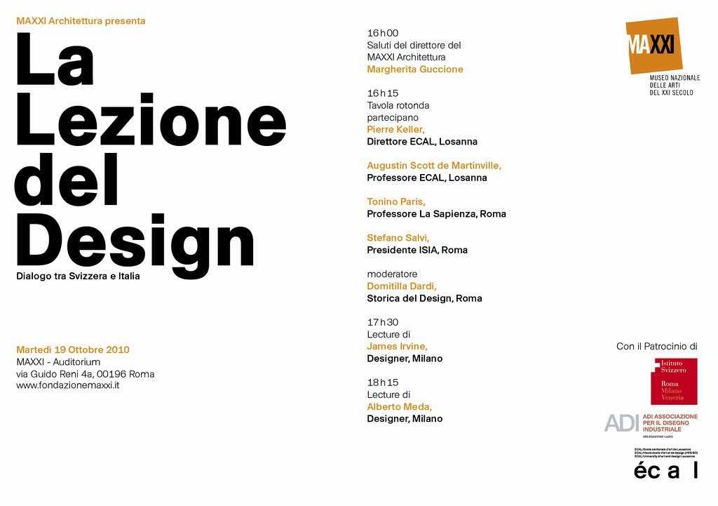 L’incontro del 19 ottobre prevede una serie di interventi articolati in una conferenza dal titolo “La lezione del design”, che avrà luogo nell’Auditorium del MAXXI.