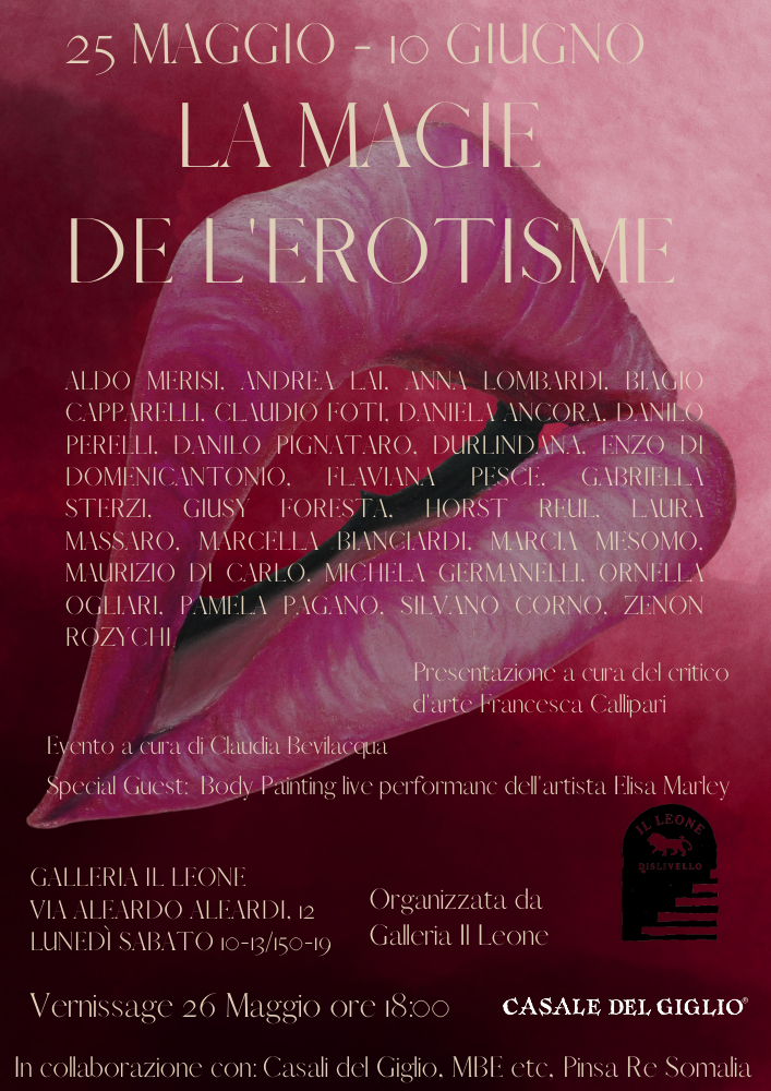 Sarà inaugurata venerdì 26 Maggio ore 18.00 presso la Galleria Il Leone di Roma la mostra internazionale “La Magie dell’erotisme”, curata dalla gallerista Claudia Bevilacqua con presentazione del critico d’arte Francesca Callipari.