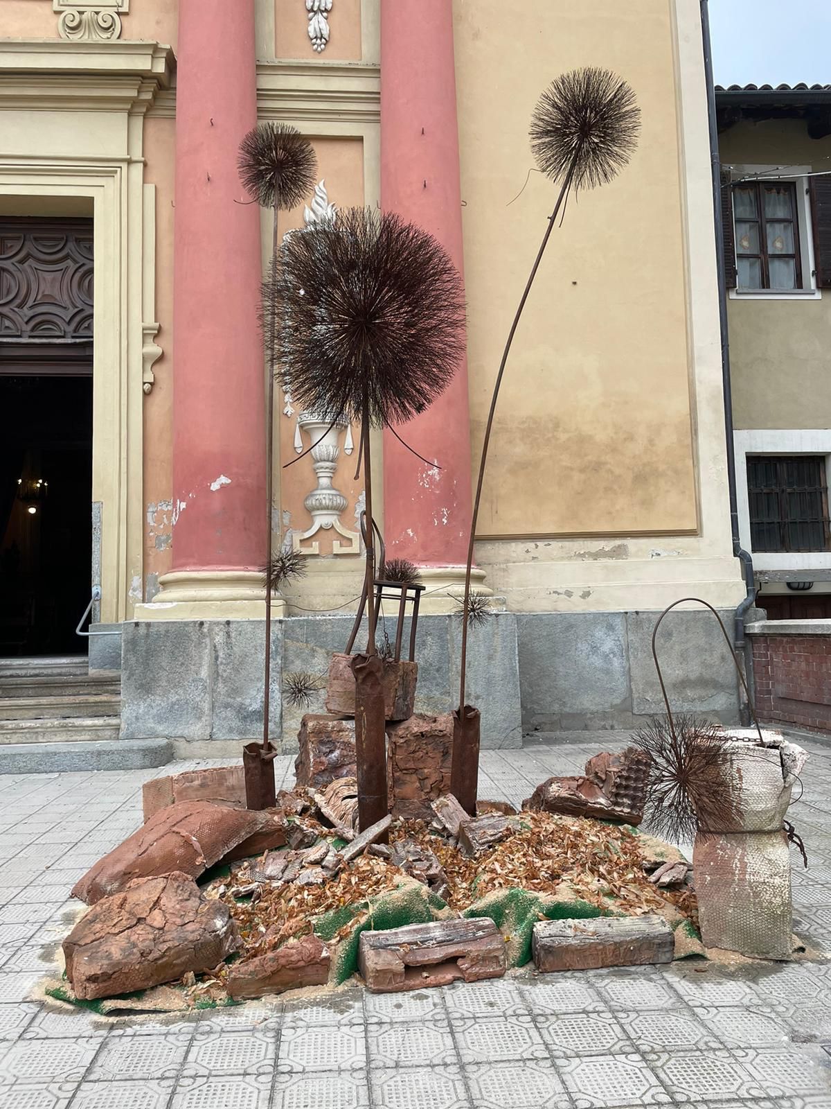 Spostandosi verso la Chiesa di San Bernardino, sul suo sagrato svetta l’opera di Theo Gallino, installazione ambientale composta da vasi in terracotta, cumuli di mattoni e steli in ferro su cui volteggiano dei grandi pollini. Il risultato di questa visione è comunemente un sentimento di tacito rispetto nei confronti della natura delicata e caparbia che germoglia ovunque e a dispetto dell’opera umana.