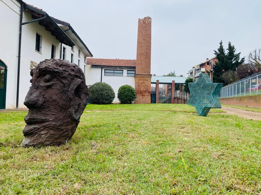 Proseguendo con le altre opere presentate nella rassegna, da quelle più datate a quelle più recenti, negli spazi esterni dell’Imbiancheria del Vajro ci si imbatte in un artista dall’indiscussa originalità, Aldo Mondino. La sua ricerca provocatoria è stata d’ispirazione per molti creativi delle generazioni successive. Le due sculture in bronzo, “Lobby Star” e “Faccia di bronzo”, di fine anni Ottanta, strappano un sorriso già a partire dai loro titoli, l’esplicito rapporto che le lega alle loro forme e la consueta ironia con cui l’artista tocca temi religiosi.