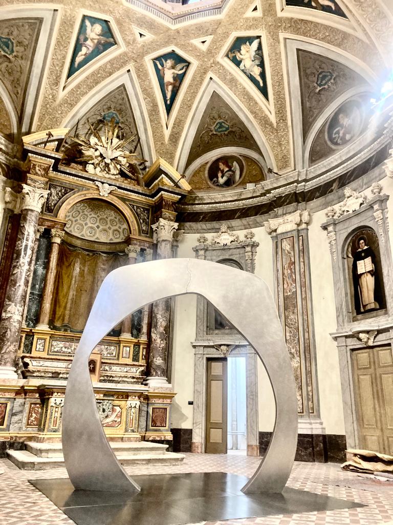 Lo stesso scenografico luogo fa da sfondo al maestoso portale in acciaio inox realizzato da Salvatore Astore, collocato al posto dell’altare come a indicarne la «sacralità». A questo effetto contribuiscono le importanti dimensioni, la forma di gusto arcaico, la superficie patinata e curvilinea e soprattutto quella crepatura che segna irrimediabilmente l’arcata, ferita che, seppur sanata, rievoca la tragica commedia umana.