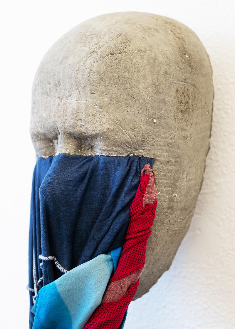 Nella stessa area il «grumo» di Paolo Grassino abbaglia per l’imponente presenza scenica. L’accumulo di corpi neri che si accavallano e stringono gli uni sugli altri, di difficile classificazione (risultato di un’abile commistione tra materiali), crea una drammatica e travolgente tensione. Le quattro teste in cemento, quindi plasmate con materiale da costruzione, da cui penzolano stoffe colorate che coprono metà dei volti, sono un pugno nello stomaco e un invito ad una riflessione profonda.