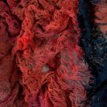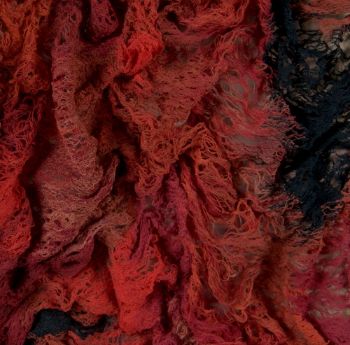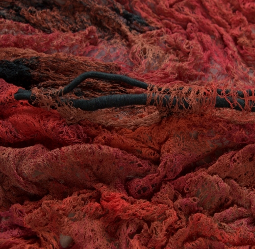 La tecnica del merletto a macchina e dell’intreccio a mano permettono a Elisabetta Cameli di ottenere delle trame che alternano trasparenze e consistenze, così come nella serie dei quattro “Burial Clothes” che si legano, come una sorta di capitolo successivo, alla scultura. Queste opere simboleggiano le pagine di vita del diario personale di ogni individuo e raccontano l’esistenza con il suo continuo mutare nel tempo. Questi tessuti di merletto diventano come delle pelli, in cui le corde sono rappresentazione di ciò che c’è dentro di noi e vuole emergere. Le opere, come vere e proprie ecdisi, costituiscono ciò che resta di noi dopo un processo di morte e rinascita, dunque di separazione. Queste spoglie tessili costituiscono un modo per preservare l’esperienza del proprio vissuto mostrando le lacerazioni, le perdite e i conflitti che ci portano alla consapevolezza di chi siamo, verso la necessaria ricerca della nostra identità.