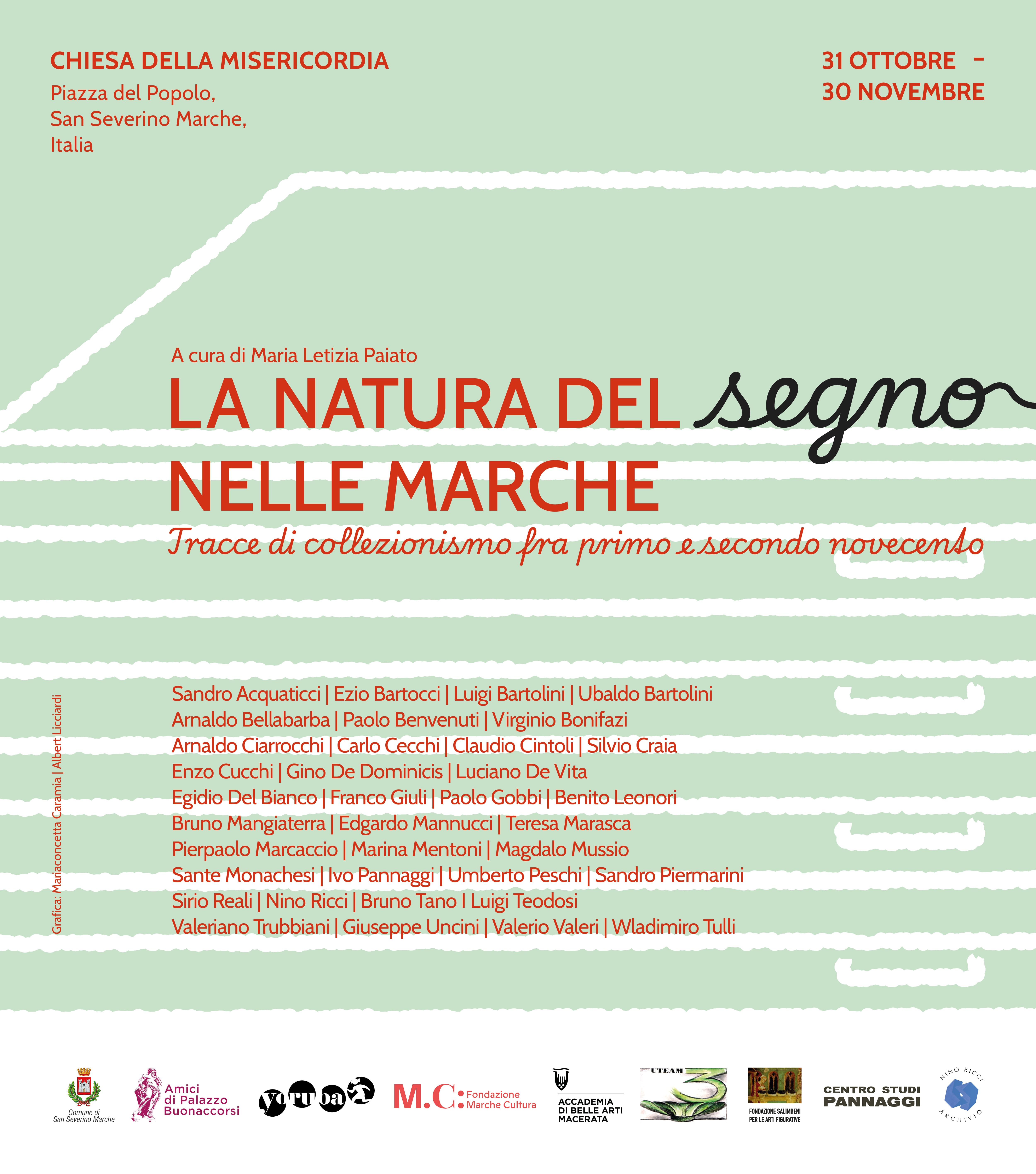 Venerdì 31 ottobre 2025, alle ore 17.30 inaugura, negli ambienti raccolti e suggestivi della Chiesa della Misericordia di San Severino Marche, antica costruzione del XIV sec., la mostra La natura del segno nelle marche. Tracce di collezionismo fra primo e secondo Novecento, a cura di Maria Letizia Paiato. Si tratta di un breve spaccato intorno al tema del disegno, o meglio del segno, con opere provenienti da collezioni private, quindi rare, quasi impossibili da vedere perché sporadicamente, se non mai, esposte al pubblico in musei o gallerie. È una piccola ma preziosa mostra che racconta un patrimonio “nascosto”, ma molto importante nella comprensione della diffusione e trasformazione del gusto nelle Marche, perlopiù delle provincie di Macerata ed Ancona, la cui importanza culturale e artistica si misura nel cospicuo numero di lavori esposti. Oltre quaranta tra autori nati fra l’inizio e gli anni Sessanta del Novecento, il cui legame nel tempo si rintraccia proprio nel motivo del segno, sempre più spesso evidenziato come punto d’unione fra artisti di generazioni diverse e dediti a soluzioni formali eterogenee, ricorrente fra gli studi e le più recenti proposte espositive di arte contemporanea in regione. Segno, disegno ovvero idea, una parola molto cara a Giovan Battista Bellori quando, nel 1664, scrive il suo celebre discorso L’idea del pittore, dello scultore e dell’architetto, intorno al quale concettualmente si richiama un primo gruppo di opere su carta di artisti maturati nell’orbita del secondo Futurismo, il movimento costituitosi a Macerata nel 1932, promosso da Bruno Tano e attivo fino al 1942. Oltre a Tano, i disegni di Ivo Pannaggi, Sante Monachesi, Umberto Peschi, Arnaldo Bellabarba e Wladimiro Tulli mostrano e dimostrano l’aderenza al linguaggio del futurismo mai abbandonata nei decenni o, come nel caso di Virginio Bonifazi un distacco da quello stile che tuttavia mai tradisce la forza dell’idea, del pensiero quale abbozzo o schizzo su cui riflettere nel processo creativo che genera l'opera pittorica, plastica o architettonica che sia. La proposta espositiva si allarga in seguito ad uno sguardo sul disegno, anche quello inciso, non più inteso come bozzetto o progetto ma come motivo autonomo, opera compiuta, completa e significativa, trasmettendo lo stile di un'immagine più complessa. Qui troviamo un ricco gruppo di artisti nati all’incirca fra la metà degli anni Venti e Quaranta, particolarmente attivi negli anni Settanta e Ottanta rispondenti ai nomi di Edgardo Mannucci, Arnaldo Ciarrocchi, Magdalo Mussio, Giuseppe Uncini, Franco Giuli, Claudio Cintoli, Silvio Craia, Luciano De Vita, Valeriano Trubbiani, Sirio Reali, Ubaldo Bartolini, Luigi Bartolini, Gino De Dominicis, Enzo Cucchi, Nino Ricci, Sandro Piermarini, Luigi Teodosi, Egidio Del Bianco, Ezio Bartocci e Carlo Cecchi. Maestri, in alcuni casi putativi e non, di tutta la successiva generazione, oggi in piena attività e anche legati al contesto accademico. Marina Mentoni, Teresa Marasca, Paolo Gobbi, Benito Leonori, Paolo Benvenuti, Sandro Acquaticci, Pierpaolo Marcaccio, Valerio Valeri e Bruno Mangiaterra chiudono questo significativo percorso espositivo che, sostenuto dall’idea di ricerca e di ricognizione di un linguaggio, vuole essere un libro aperto sull’arte del segno praticato in queste zone delle Marche, affrontando, senza pretese di esaustività ma in modo libero, espressioni creative caratterizzanti il territorio.