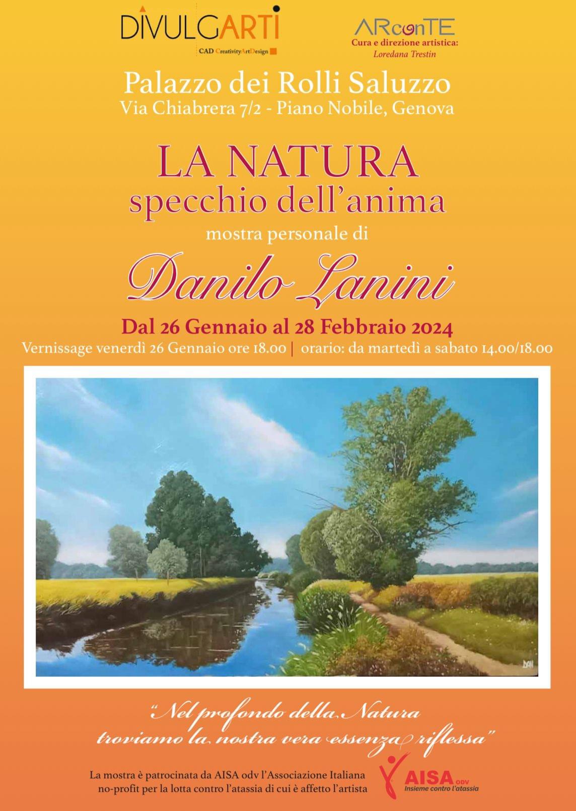 Il 26 Gennaio alle ore 18, presso il CAD Creativity Art Design di Genova, si inaugura la mostra di arte contemporanea di Danilo Lanini, "LA NATURA SPECCHIO DELL’ANIMA", a cura di Loredana Trestin. La mostra, patrocinata dall'AISA ODV, sarà aperta al pubblico dal martedì al sabato dalle 14 alle 18 fino al 28 febbraio 2024.