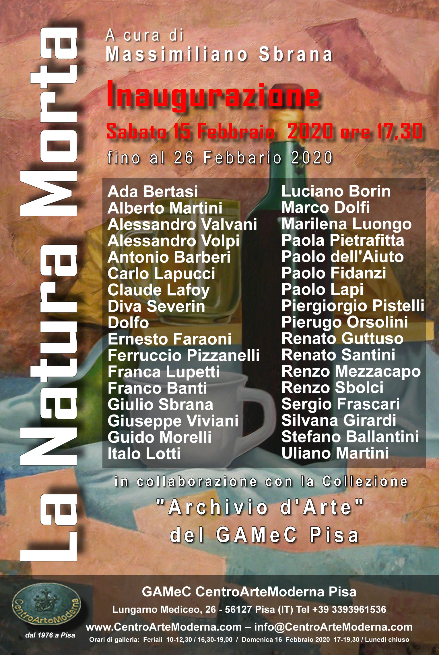 Si inaugura Sabato 15 Febbraio 2020 alle ore 17,30 presso il GAMeC CentroArteModerna di Pisa (Lungarno Mediceo n.26) curata da Massimiliano Sbrana, la mostra "La Natura Morta" edizione 2020.