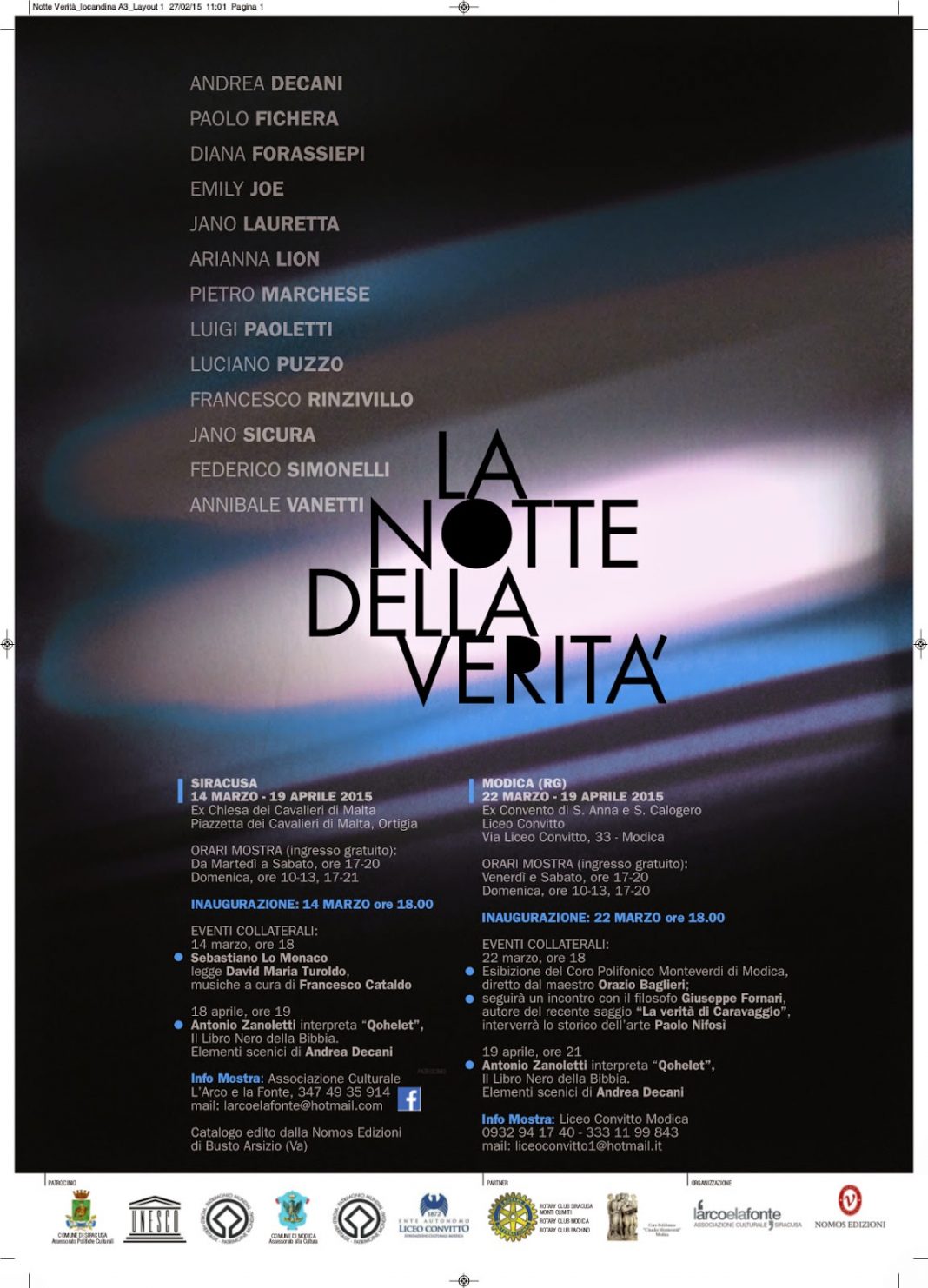 Il primo evento in calendario è previsto sabato 14 marzo alle ore 18.00 nell'ex chiesa dei Cavalieri di Malta (Piazzetta dei Cavalieri di Malta, Ortigia) a Siracusa con l'inaugurazione di una collettiva d'arte dal titolo “La notte della verità”. In mostra opere di Andrea Decani, Paolo Fichera, Diana Forassiepi, Emily Joe, Jano Lauretta, Arianna Lion, Pietro Marchese, Luigi Paoletti, Luciano Puzzo, Francesco Rinzivillo, Jano Sicura, Federico Simonelli e Annibale Vanetti. La mostra, visitabile fino al 19 aprile, osserverà i seguenti orari: tutti i giorni, tranne il lunedì, dalle ore 17.00 alle ore 20.00; domenica dalle ore 10.00 alle 13.00 e dalle ore 17.00 alle 21.00 (catalogo a cura della Nomos Edizioni di Busto Arsizio).