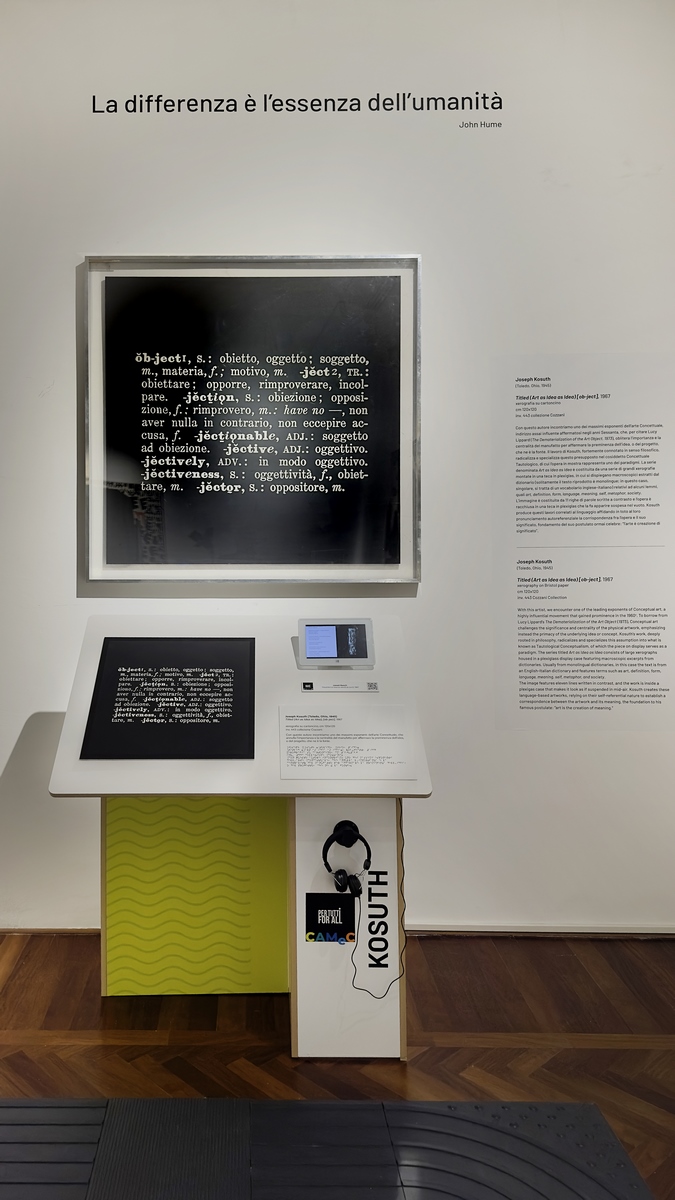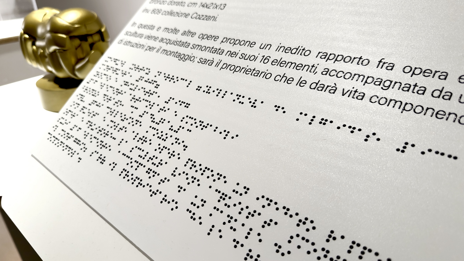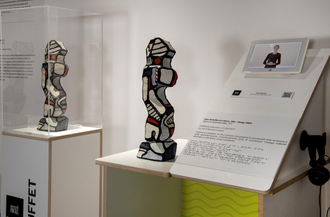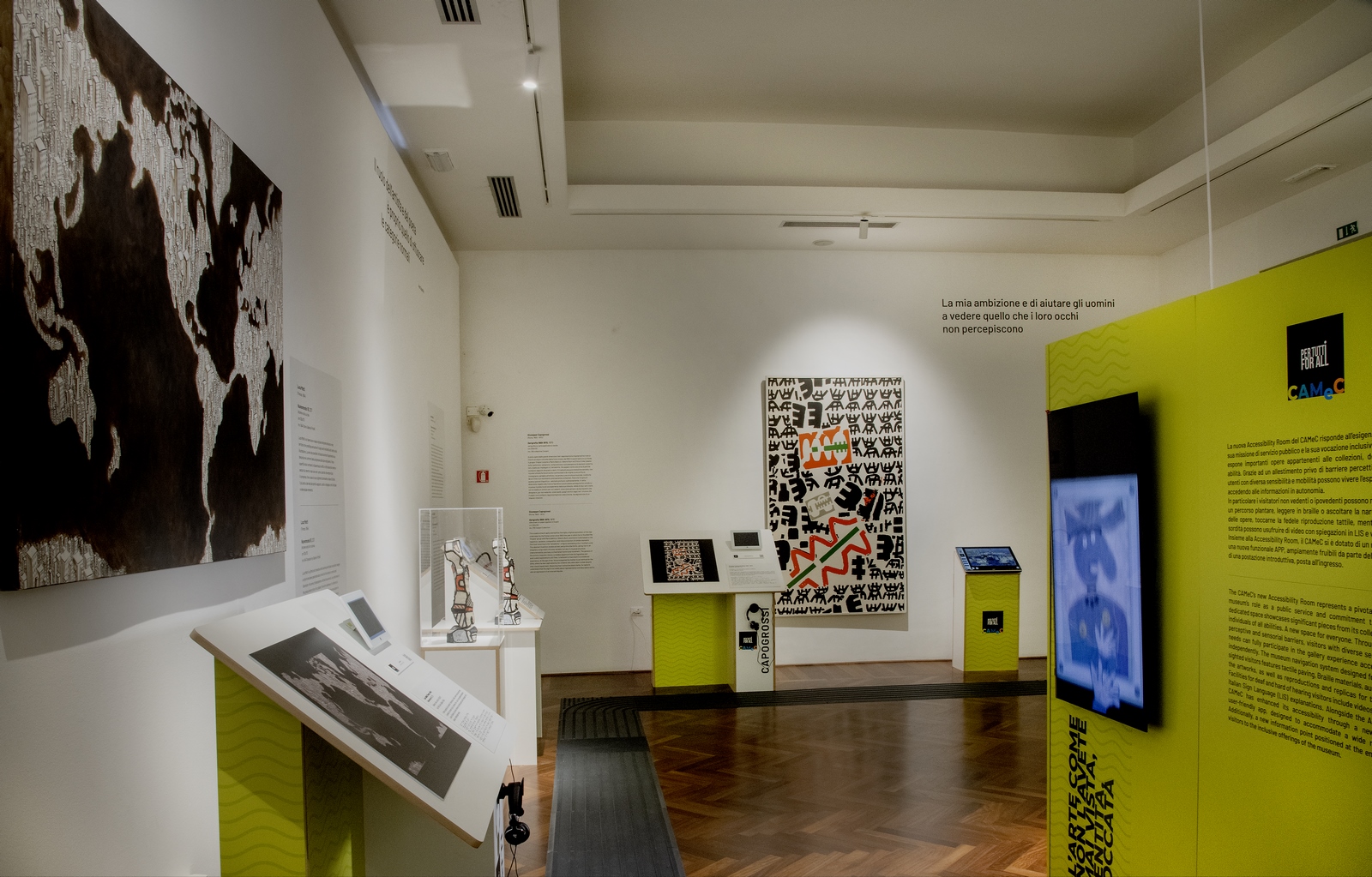 Questo spazio dedicato permanente offre, con particolare riguardo a visitatori ipovedenti, non vedenti, con sordità e con difficoltà motorie, la possibilità di incontrare e conoscere un florilegio dal patrimonio del CAMeC, grazie ad apparato didascalico diversificato ed ampliato, che abbatte le barriere percettive e sensoriali: a parete, una didascalia storico-critica bilingue (italiano e inglese) e una postazione multimediale, agevolmente fruibile anche in carrozzina, comprensiva di un ausilio tattile che riproduce il contenuto formale dell’opera, se bidimensionale, o la replica, se scultura, didascalie in braille e a rilievo, supporto audio in cuffia, supporto digitale con video in LIS (Lingua dei Segni Italiana). Le opere esposte sono 8, particolarmente adatte ad una fruizione inclusiva: esse si prestano in special modo ad una lettura tattile, agevole e gradevole per visitatori non vedenti o ipovedenti. Nel contempo, i 5 dipinti e le 3 sculture ben documentano la rilevanza delle raccolte del CAMeC, anche in ambito internazionale. L’opera più lontana nel tempo risale al 1949 e si deve a Renato Guttuso, vincitore del primo Premio Nazionale di Pittura “Golfo della Spezia”; è l’incipit del nucleo più antico delle collezioni del museo, che questa importante rassegna ha consegnato alla città. I lavori di Baj, Berrocal, Capogrossi, Dubuffet, Kosuth, Mirko appartengono alla raccolta Cozzani, silloge enciclopedica, composta con gusto raffinato e lungimirante dal collezionista spezzino. La tela di Luca Matti invece è una più recente acquisizione e risponde agli obiettivi di aggiornamento costante della collezione permanente.