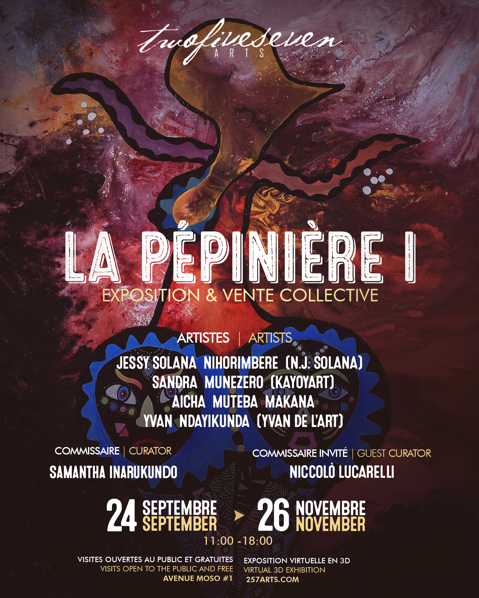 Il risultato della residenza è adesso condiviso con il pubblico attraverso la collettiva La Pépinière 1, curata da Samantha Inarukundo e Niccolò Lucarelli, che coinvolge i giovani pittori burundesi Jessy Solana Nihorimbere, Sandra Munezero e Yvan Ndayikunda, e Aicha Muteba Makana della Repubblica Democratica del Congo. L'inaugurazione si terrà venerdì 23 settembre alle ore 17, alla presenza di un rappresentante del Ministero della Cultura del Burundi. La mostra resterà aperta fino al 26 novembre prossimo; 18 le opere esposte, tutte realizzate durante la residenza artistica, 18 modi di sentire l'Africa con la sua cultura e le sue tradizioni.