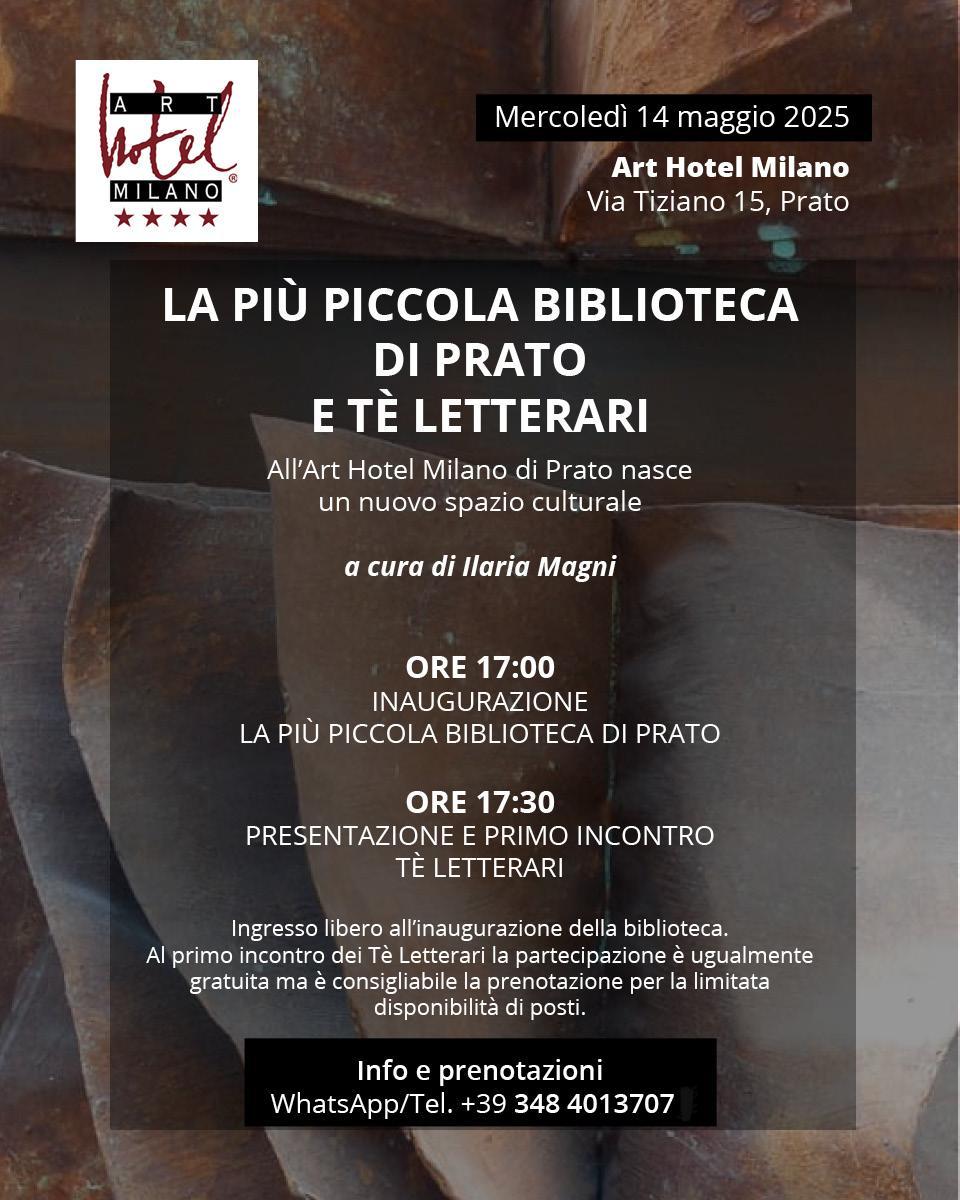 In un momento storico in cui la relazione tra la salute, la socialità e l’accesso alla cultura è più che mai un tema d’interesse, nasce a Prato un progetto che mette al centro il benessere integrato della persona. Mercoledì 14 maggio alle ore 17, presso l’Art Hotel Milano, sarà inaugurata “La più piccola biblioteca di Prato”, uno spazio di lettura e condivisione, accompagnato dal lancio del ciclo di incontri “Tè Letterari – Viaggi di Carta”, entrambi curati dalla storica dell’arte Ilaria Magni.