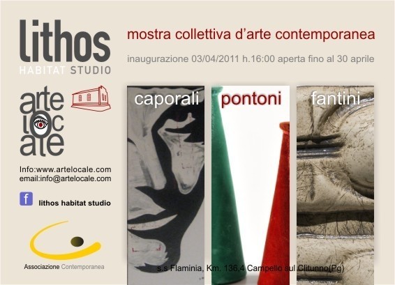 Presso la Galleria Lithos verrà inaugurata la Mostra collettiva d’arte contemporanea, curata dal gruppo Arte Locale, dove esporranno tre artisti Federico Caporali, Francesco Fantini di Città di Castello, e la romana di nascita ma perugina d’adozione Rossana Pontoni. L’inaugurazione si terrà alle ore 16.00 del 3 aprile. Mentre l’esposizione rimarrà aperta fino al 30 aprile 2011.