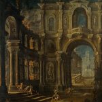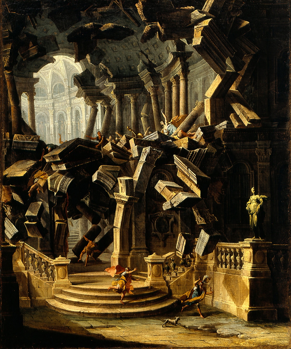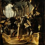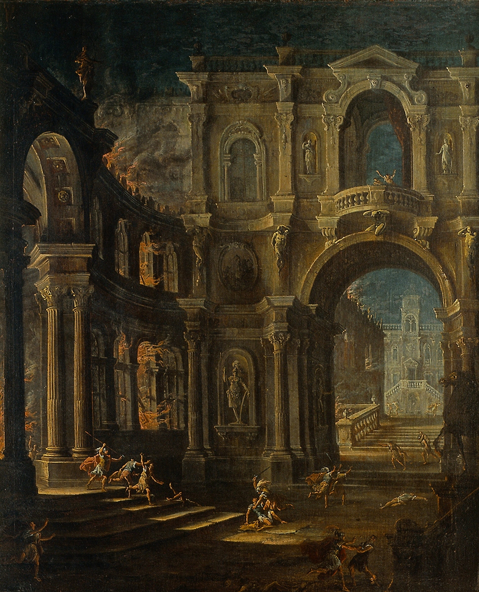 «Queste tele – scrive la curatrice – con la loro affascinante commistione di artificio e verità ci immergono nel mondo effimero e vivace dei teatri e della scenografia della corte estense agli inizi del Settecento e ci rimandano a quelle suggestive ‘apparenze di scena’ che si susseguivano sapientemente durante gli spettacoli: ‘atrii grandi illuminati, fabbriche remote e rovinate, fabbriche diroccate’. Già nel secolo precedente si erano affermate a Modena con grande successo le specializzazioni pittoriche del quadraturismo, del rovinismo e della scenografia prospettica. Nella città estense di primo Seicento, da poco assurta al rango di capitale del ducato, vengono impiegati progettisti e scenografi, architetti e noti pittori che, all’occasione, si cimentano in ardite invenzioni per offrire al pubblico artifici mirabolanti e soddisfare le richieste di una corte consapevole dell’importanza del messaggio dell’arte ai fini della propria celebrazione. Provengono in gran parte dalla vicina Bologna, il centro propulsore della cultura scenografica e teatrale del tempo, e realizzano imprese decorative assai vaste mostrandosi in grado anche di creare apparati scenici e festivi di carattere effimero: macchine, caroselli, tornei, giochi d’acqua e ‘fuochi d’allegrezza’. La tradizione scenografica emiliana riceve un impulso decisivo, tra la fine del Seicento e l’inizio del Settecento, con l’adozione della “scena per angolo” per opera di Ferdinando Galli Bibiena, del tutto innovativa rispetto alle tradizionali costruzioni prospettiche a unico asse centrale di ascendenza rinascimentale tipiche del teatro barocco. In questo contesto culturale si inserisce la produzione giovanile di Antonio Joli. Le opere qui presentate, nella soluzione del taglio obliquo della veduta, nei motivi di balaustre e di balconate aggettanti, denunciano un puntuale rimando ai dettami bibieneschi. Senza dubbio, per la loro forte evocazione di macchine e quinte teatrali, costituiscono trasposizioni di scenografie smarrite da collegare a opere musicali messe in scena intorno al 1725 al suo ritorno da Roma. In particolare nel Sansone la bellissima invenzione di rappresentare il crollo in atto costituisce una rarissima annotazione di tecnica teatrale, il cosiddetto ‘diroccamento a vista’, in cui, una macchina teatrale azionata per mezzo di complesse manovre di funi, pesi e contrappesi, anziché rappresentare staticamente un cumulo di macerie, fissa la dinamica del crollo proprio nel momento in cui l’architettura sta per abbattersi con fragore sul palcoscenico».