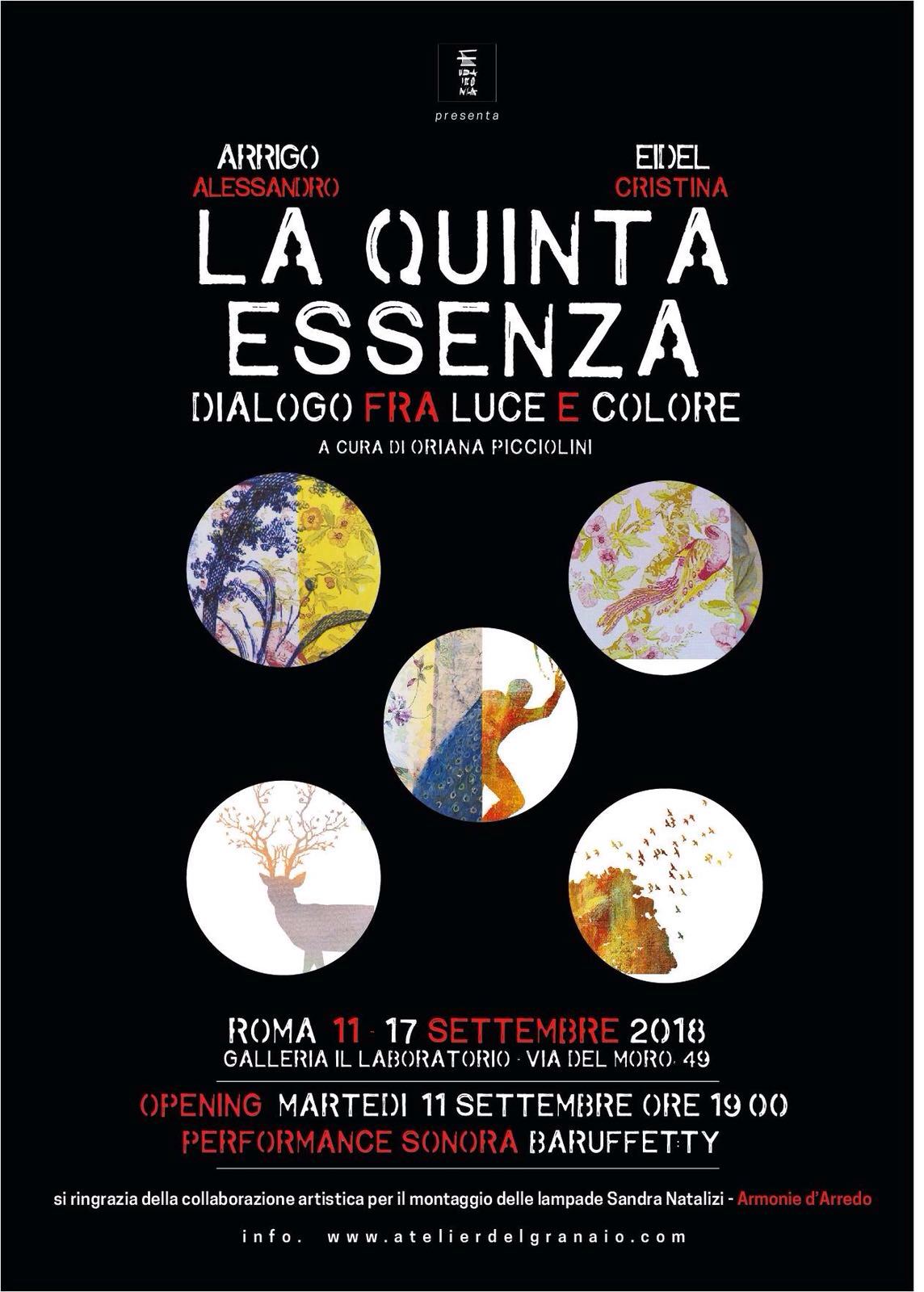 La quinta essenza nella fisica greca è un quinto elemento che si aggiunge, con caratteristiche peculiari, ai quattro elementi (terra, acqua, aria, fuoco) è l’etere. Alessandro Arrigo e Cristina Eidel hanno voluto identificarlo con il concetto della luce. La luce come forma di “illuminazione” ma anche di principio di vita e di moto e quindi anche di volo. II “volo” è una costante nei lavori di Arrigo e di Eidel, che da anni insieme e in maniera singola hanno realizzato opere e lavori che prendevano spunto dal porsi su un piano diverso nell’osservare le cose intorno a loro. Le lampade realizzate da Cristina Eidel sono dei piccoli racconti poetici. Lo studio dei colori conferisce alla luce un’atmosfera che ricorda le lanterne giapponesi. Nelle illustrazioni di Alessandro Arrigo una costante è la scoperta di un modo onirico legato al muoversi nell'aria. La sua ultima ricerca artistiche legate al “toccare” le sue illustrazioni per illuminarle, serve a eliminare il distacco fra il pubblico e l’opera. Eidel e Arrigo dal 2014 lavorano in progetti comuni che hanno visto dar luce per Atelier del Granaio a camere d’autore e allestimenti con opere originali per alberghi d’arte creando delle vere e proprie installazioni artistiche sul concetto di creare bellezza ed armonia nei luoghi di passaggio. Le opere in mostra a Roma a settembre nella Galleria “Il Laboratorio” in via del Moro 49 a Trastevere per “La Quinta Essenza” a cura di Oriana Picciolini si ispirano all’ estetica anglosassone delle Arts and Crafts ma anche allo stile giapponese ukiyo-e, rielaborandoli e sintetizzandoli in una chiave moderna. La luce come forma di dialogo fra le lampade di Cristina Eidel, piccoli racconti poetici dove lo studio dei colori conferisce un’atmosfera che ricorda le lanterne giapponesi e le illustrazioni di Alessandro Arrigo che, in alcuni casi, dovranno essere letteralmente “toccate” per essere viste, una ricerca artistica legate allo “svelare” le opere tramite un interazione per eliminare il distacco fra il fruitore e l’opera.