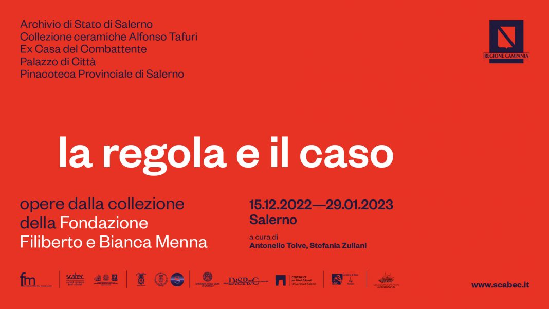 “La regola e il caso. Opere dalla collezione della Fondazione Filiberto e Bianca Menna” è il titolo della mostra diffusa a cura di Antonello Tolve e Stefania Zuliani. Programmata e finanziata dalla Regione Campania (POC 2014-2020), prodotta e promossa dalla Scabec e dalla Fondazione Filiberto e Bianca Menna con il patrocinio del DISPAC (Dipartimento di Scienze del Patrimonio Culturale dell’Università di Salerno) e del Centro Ict per i Beni Culturali dell’Università di Salerno, la mostra propone una serie di opere appartenute ai Menna, dei quali raccontano frammenti di storia intellettuale e di passione civile attraverso la relazione con specifici spazi dell’arte e della vita culturale di Salerno.
