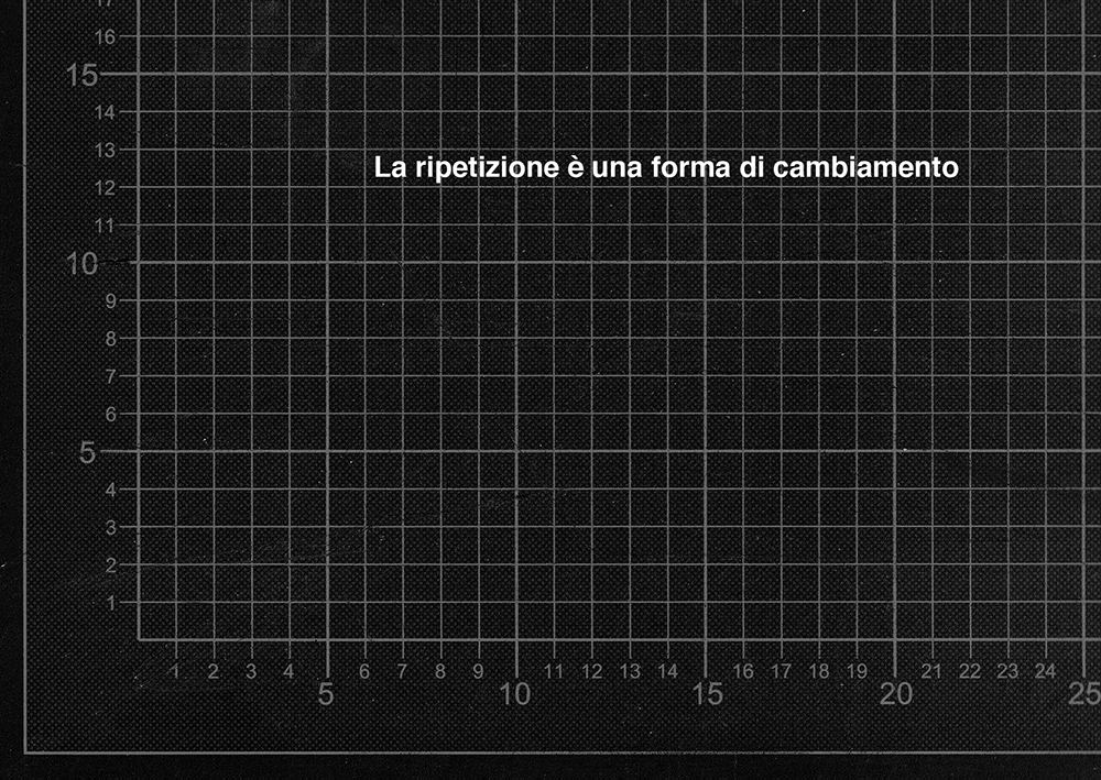 “La ripetizione è una forma di cambiamento” è una frase contenuta in “Strategie Oblique”, opera prodotta nel 1975 dal musicista Brian Eno e dall’artista Peter Schmidt, che consiste in una serie di aforismi e consigli che artisti e musicisti utilizzano per superare i blocchi creativi. La frase sottintende che l’identico non esiste, come in “Differenza e ripetizione” di Gilles Deleuze, in cui il filosofo francese afferma che “tutte le identità sono simulate, prodotte come un effetto ottico per mezzo di un gioco più profondo che è quello della differenza e della ripetizione”. Deleuze sostiene inoltre la necessità di distinguere fra due tipi di ripetizione: la prima, che lui definisce “vestita”, è un'unica reiterazione astratta che incessantemente torna su sé stessa per affermare il differente come tale. Ciò che si ripete quindi non è identico, ma è identico il ripetersi di ciò che si ripete. La seconda, che Deleuze definisce “nuda”, è il mondo delle copie, dove la differenza è ridotta a somiglianza, a analogia, a negativo, e a identico ovvero alle quattro modalità della similitudine descritti da Foucault ne “Le parole e le cose”.