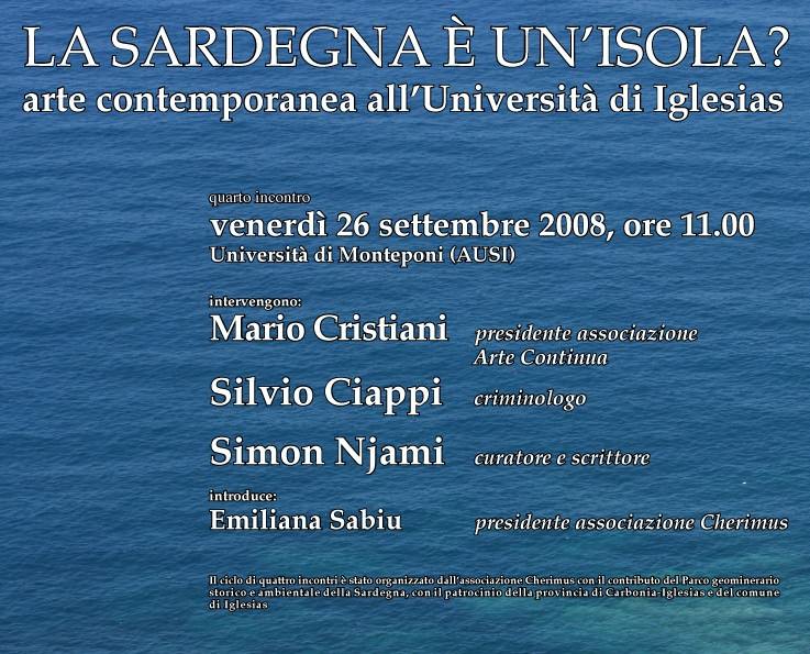 L’associazione Cherimus presenta la quarta conferenza del ciclo “la Sardegna è un’isola?”, al fine di creare un confronto fra questa regione, in particolare il Sulcis-Iglesiente, e l’arte contemporanea.