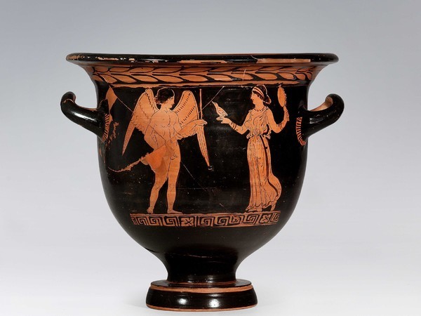 L’esperienza d’amore nella cultura greca è considerata fortemente intrisa di religiosità posta sotto l’egida di Afrodite, la dea seduttrice per eccellenza. A lei e a Eros è dedicata la prima sezione della mostra in cui, attraverso le ra gurazioni dei vasi e tre esemplari statuari dal Museo Archeologico Nazionale di Napoli, sarà tracciata la personalità di queste divinità e il culto a loro dedicato. Una delle più grandi seduttrici che il mito greco ci ha restituito è Elena di Sparta (seconda sezione della mostra), capace di ammaliare e fascinare con la sua proverbiale bellezza principi ed eroi. Le sue vicende e il suo potere seduttivo sono indagate a partire dal cratere di Intesa Sanpaolo che la ritrae insieme ai fratelli Dioscuri, e da una loutrophoros, forma vascolare legata alle nozze e al mondo femminile, dal Museo Archeologico Nazionale di Napoli. Parallelamente è tracciata la personalità dei maschi seduttori che nella mentalità greca sono agli antipodi dei valorosi eroi guerrieri.