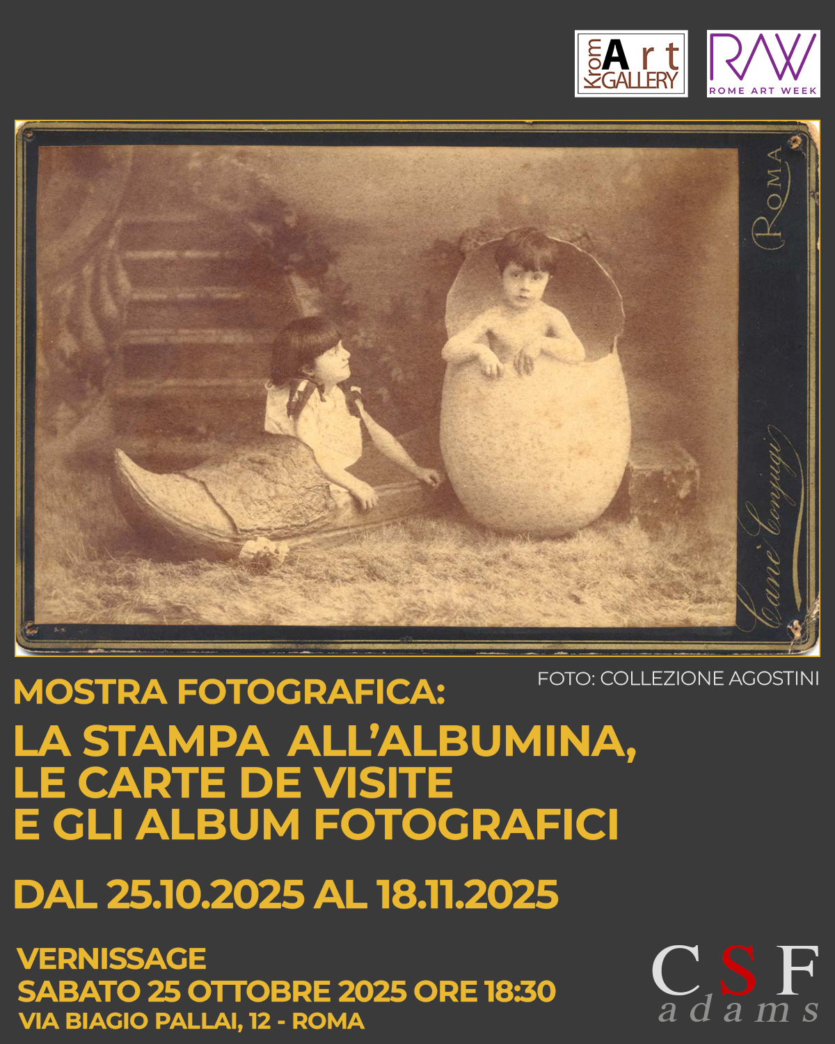 Il CSF adams in collaborazione con Kromart gallery proporrà un ciclo di mostre espositive con materiali fotografici originali realizzate con tecniche “storiche” (dagherrotipo, calotipo, ferrotipo, stampe all’albumina, stampa su vetro, collodio umido, etc.). Conoscere le antiche tecniche di fotografia attraverso un ciclo di esposizioni ha molti livelli di importanza — storico, artistico, tecnico, culturale — e può arricchire sia chi pratica la fotografia che chi la apprezza. Le esposizioni saranno corredate anche dalla presenza di materiali vari, quali apparecchi, inchiostri, carte, lastre, cornici, manuali, album, afferenti al periodo storico preso in esame. Crediamo che l’obiettivo di questo percorso possa contribuire a comprendere le origini e l’evoluzione della fotografia, il suo valore artistico ed espressivo, sviluppando l’educazione tecnica e la sensibilità visiva, responsabilizzando a corrette pratiche di conservazione e tutela del patrimonio fotografico, dell’identità culturale e della memoria collettiva. Inoltre riteniamo che la presenza dal “vivo” delle antiche tecniche possa stimolare lo studio dell’influenza sul contemporaneo e essere da incentivo alla sperimentazione. Alcune esposizioni saranno affiancate da seminari tematici che si avvarranno della presenza di esperti. I materiali esposti provengono da collezioni private. Si ringraziano fin d’ora i prestatori di opere, di materiali e tutti coloro che con il proprio contributo renderanno possibile questo percorso di idee ed emozioni.