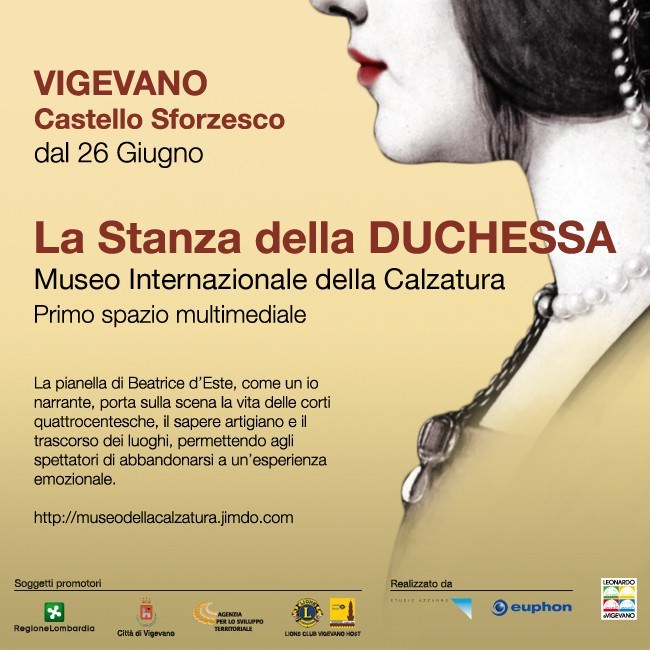 Il Museo Internazionale della Calzatura di Vigevano (MIC), città rinomata per la sua antica tradizione calzaturiera, arricchisce il suo percorso espositivo -che conta circa 3000 pezzi di varie epoche e luoghi- di una sala multimediale, curata da Studio Azzurro ed Euphon. Ne La Stanza della Duchessa immagini e racconti fluttuano intorno ad una pianella della fine del’400, riprodotta appositamente per l’occasione da maestranze locali e la cui versione originale è visitabile nel museo. La scarpa, che la tradizione popolare vuole sia stata indossata dalla duchessa Beatrice D’Este (moglie di Ludovico Sforza, duca di Milano), diventa protagonista di una narrazione multimediale che spazia dalla storia di Beatrice alla tradizione artigianale e lo sviluppo locale