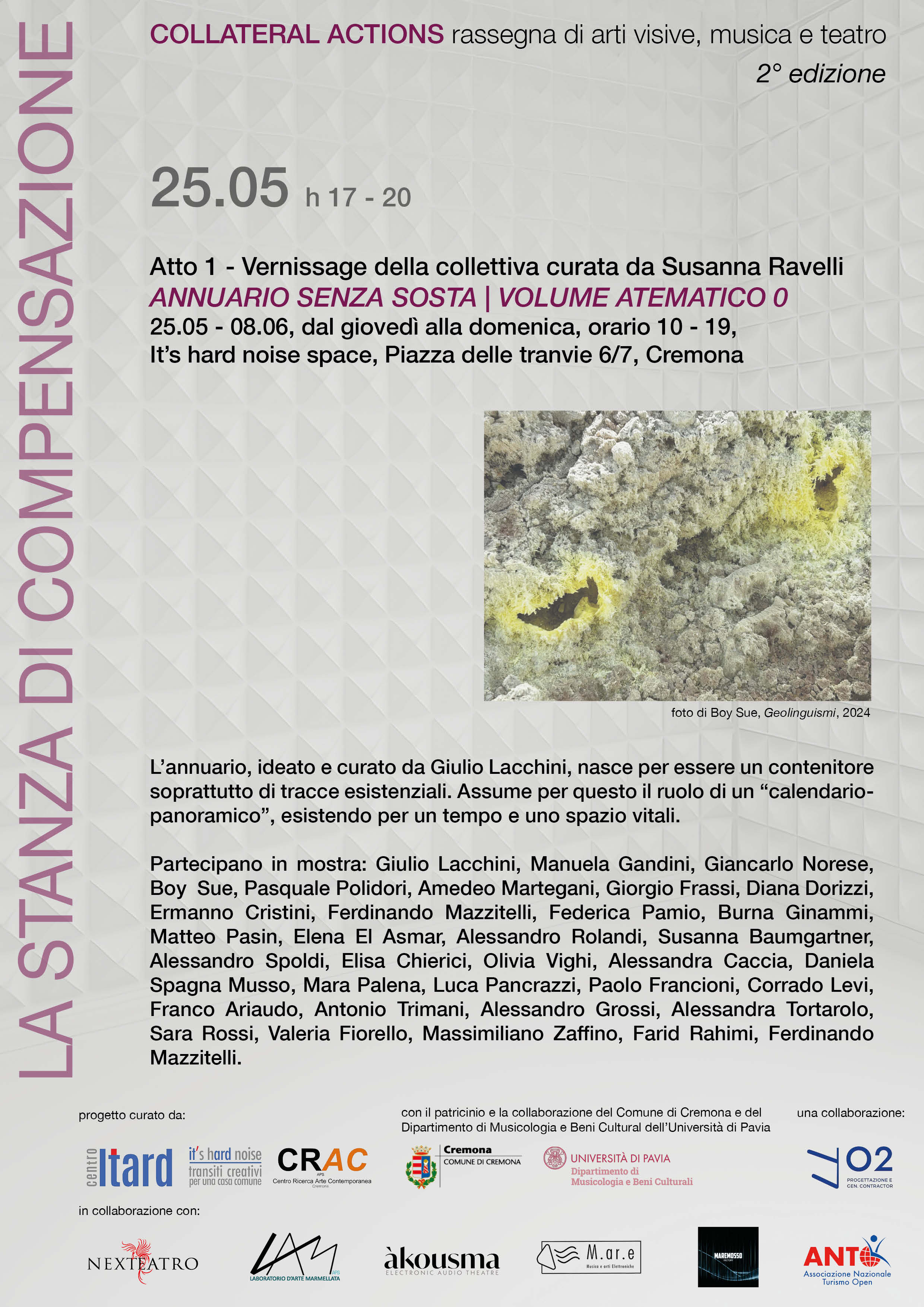 La rassegna si apre il 25 maggio nello spazio It’s hard noise in Piazza delle Tranvie 6/7 (autolinee bus) dalle ore 17.00 alle 20.00 con il pre-opening della mostra ANNUARIO SENZA SOSTA / VOLUME ATEMATICO 0, tratta dall’ omonimo annuario ideato e curato da Giulio Lacchini. L’Annuario, che apre l’esposizione, nasce per essere un contenitore soprattutto di tracce esistenziali, assumendo il ruolo guida di un “calendario-panoramico” annuale, in grado di mettere in relazione le vite di artiste e artisti, attraverso le proprie visioni e opere. La mostra raccoglie le connessioni di un percorso libero, un dialogo aperto e senza traccia prestabilita che avviene tra le opere della collettiva e il libro Volume Atematico 0 per mezzo delle infinite e sottili relazioni che gli sguardi dei visitatori riescono a delineare.