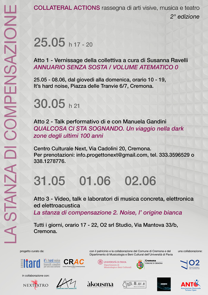 Il programma, curato da Dino Ferruzzi, Susanna Ravelli, Ingrid Pustianac, Francesca Scigliuzzo e Fosco Lucini si terrà negli spazi cittadini di It’s hard noise in Piazza delle Tranvie 6/7 (autolinee bus), del Centro Culturale Next in Via Cadolini 20 e di La stanza di compensazione, in Via Mantova 33/b O2 srl Studio.