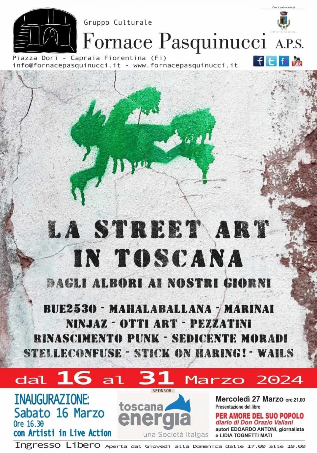 Per la prima volta nell’area espositiva di Capraia Fiorentina viene presentata un’esposizione sulla street art in Toscana che ne ripercorre la sua storia. Saranno esibite opere dei “pionieri” assieme a quelle di alcuni degli street artist attuali più attivi e significativi.