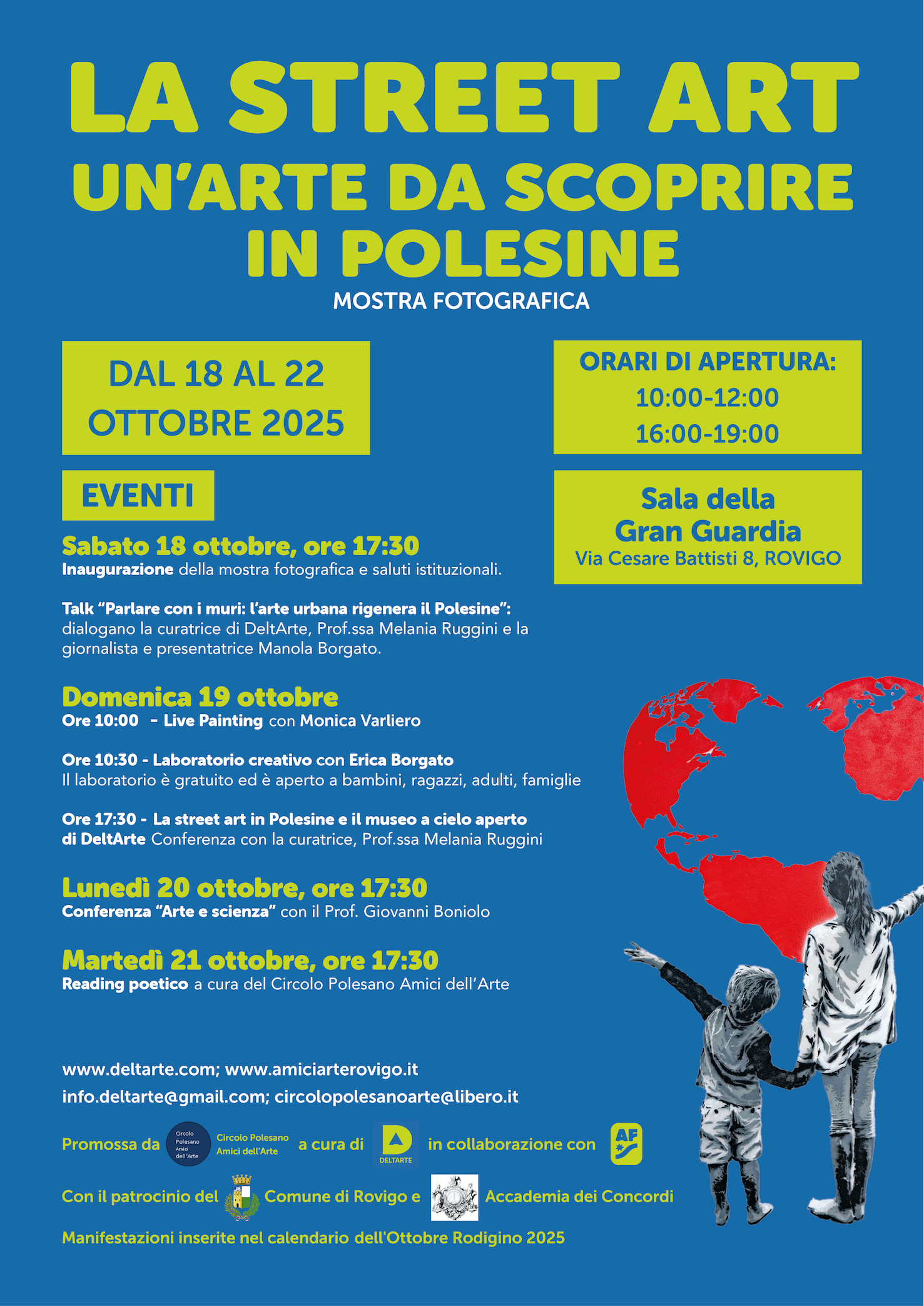 In collaborazione con il Circolo Polesano Amici dell’Arte, grazie all’invito del Presidente Giorgio Lazzarini, in occasione dell’Ottobre Rodigino DeltArte presenta una mostra fotografica dedicata ai murales più significativi realizzati in Polesine da street artist di fama nazionale.