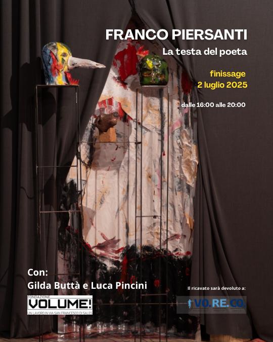 Il 2 luglio 2025, dalle 16:00 alle 20:00, la Fondazione VOLUME! ospita il finissage della mostra La testa del poeta di Franco Piersanti. Performance dal vivo e raccolta fondi per Vo.Re.Co.: con un’offerta minima di 20,00€ è possibile acquistare un frammento dell’opera.