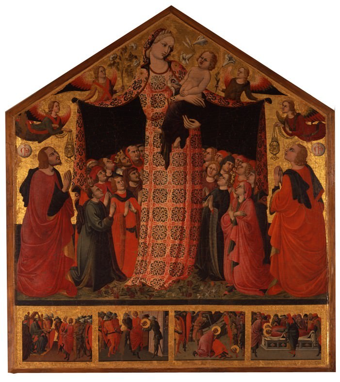 La mostra, a cura di Isabella Droandi ed Ersilia Agnolucci, si incentra sul dipinto su tavola di Parri di Spinello (1387 – 1453) raffigurante La Madonna della Misericordia con i Santi Lorentino e Pergentino, di proprietà della Fraternita, che si conserva nel Museo Statale d’Arte Medievale e Moderna di Arezzo. Con questa mostra l’opera ritorna così, temporaneamente, nella sua sede d’origine con il consenso della Soprintendenza di Arezzo in onore alla pertinenza con il luogo di esposizione e con la storia della Fraternita. Infatti, nel 1435, l’Ente commissionò a Parri il dipinto da porre sull’altare della Chiesa dei Santi Lorentino e Pergentino. Il tema da svolgere riguardava l’immagine simbolo della pia istituzione, che già suo padre Spinello aveva rappresentato – come testimoniato dal Vasari - sulla facciata della stessa chiesa (affresco perduto con la ristrutturazione settecentesca dell’edificio).