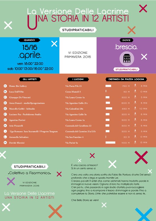 Studipraticabili nasce nell’ottobre 2013 in occasione della giornata del contemporaneo indetta da “Amaci”, dalla volontà di alcuni artisti operanti a Brescia, mossi dal desiderio di aprire i propri studi e di renderli praticabili e fruibili. Cosa che si realizzerà in questi due giorni