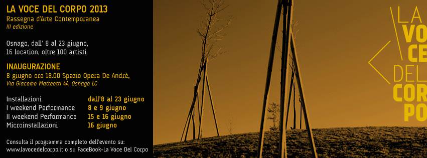 LA VOCE DEL CORPO è rassegna artistica risultato di un bando richiedente performance, installazioni, video arte inerenti ad un tema: TEGUMENTO. Osnago (LC) ospiterà più du settanta artisti per le piazze e le vie fino a interessare siti di alto valore storico come la Torciera di Villa Arese Lucini.