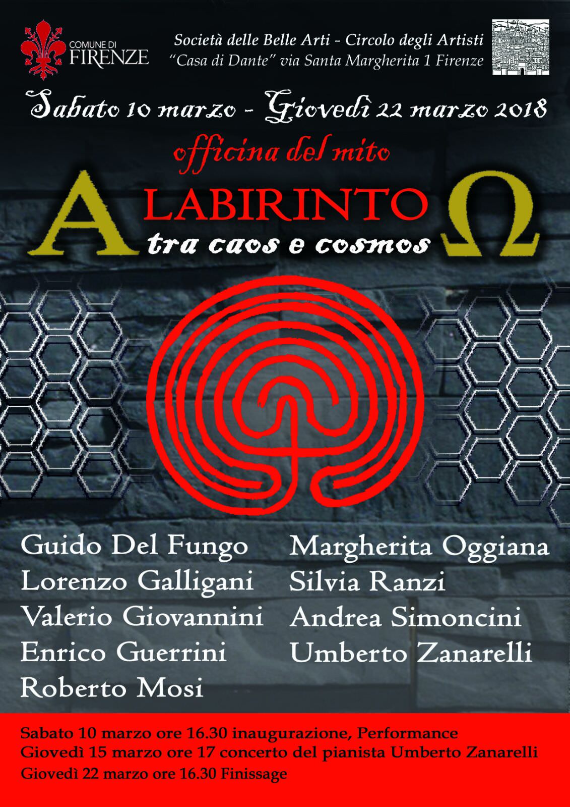 L’inaugurazione della mostra “- Labirinto tra caos e cosmos -Ω” avrà luogo Sabato 10 Marzo 2018 alle ore 16.30 presso la Società delle Belle Arti- Circolo degli Artisti “Casa di Dante”, in via Santa Margherita n.1/r, Firenze. La mostra sarà presentata dalla critica e storica dell’arte Virginia Bazzechi Ganucci Cancellieri e in tale occasione si terrà anche una Performance.