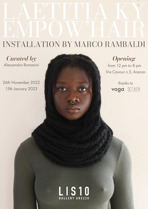 la mostra dell’artista ivoriana Laetitia Ky, intitolata “Empow’Hair”, concepita espressamente per gli spazi espositivi della galleria LIS10 di Arezzo è composta da un ciclo di opere fotografiche e dada un’installazione del giovane stilista Marco Rambaldi (Bologna 1990).