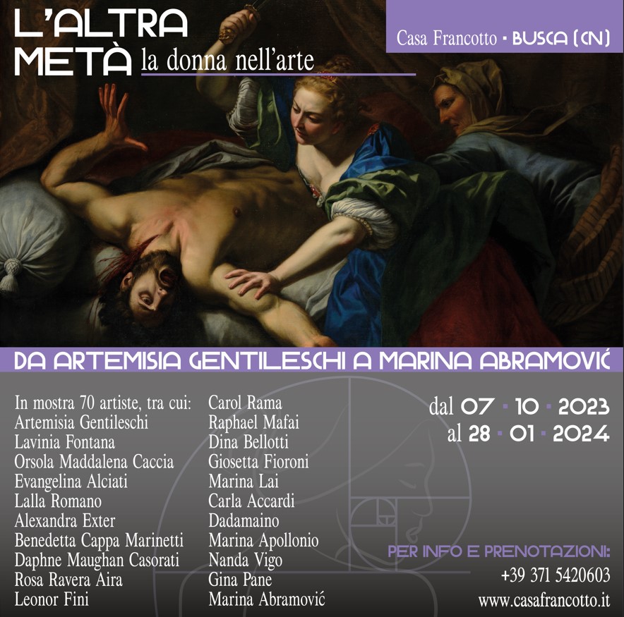 A Casa Francotto (Busca) continua l’apertura della mostra L’ALTRA META’ - La donna nell’arte Da Artemisia Gentileschi e Marin Abramovic, curata da Cinzia Tesio e Rino Tacchella, composta da un percorso di 120 opere declinato al femminile dal Seicento ai giorni nostri. Domenica 29 ottobre, abbinata alla Mostra verrà organizzata (posti limitati e su prenotazione) l’iniziativa ALLA SCOPERTA DI BUSCA in collaborazione con Ingenium e i massari di San Giacomo. Con lo stesso biglietto saranno visitabili le visite alle Cave di alabastro e la restaurata cappella di San Giacomo Maggiore.