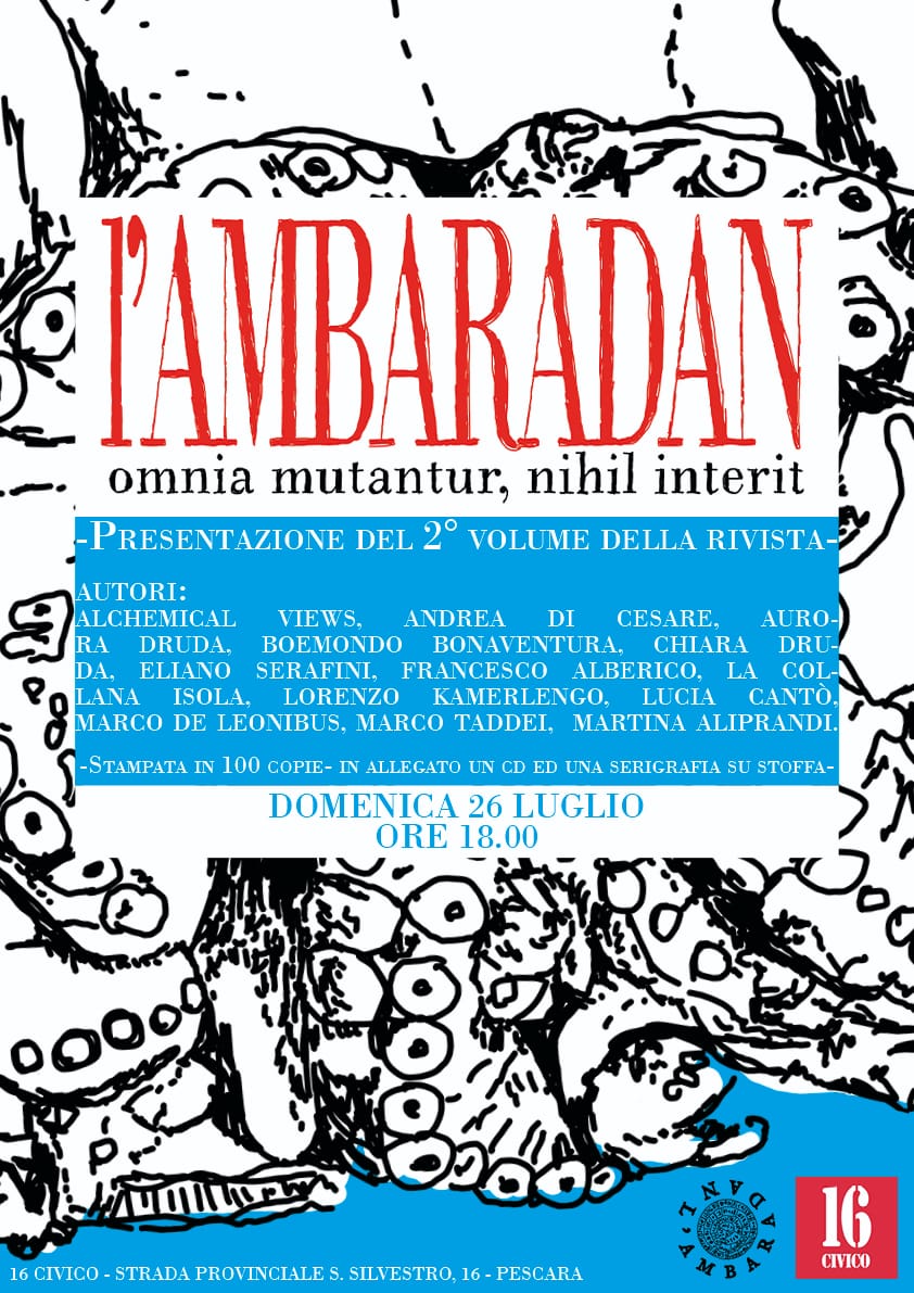 Domenica 26 luglio, presso lo spazio espositivo 16 civico, dove è attualmente in corso la mostra “Terzo paesaggio- Territorio di diversità”, avrà luogo la presentazione del secondo volume de “l’Ambaradan”. La rivista, stampata in cento copie numerate, assume con questo secondo numero un corpo cartaceo.