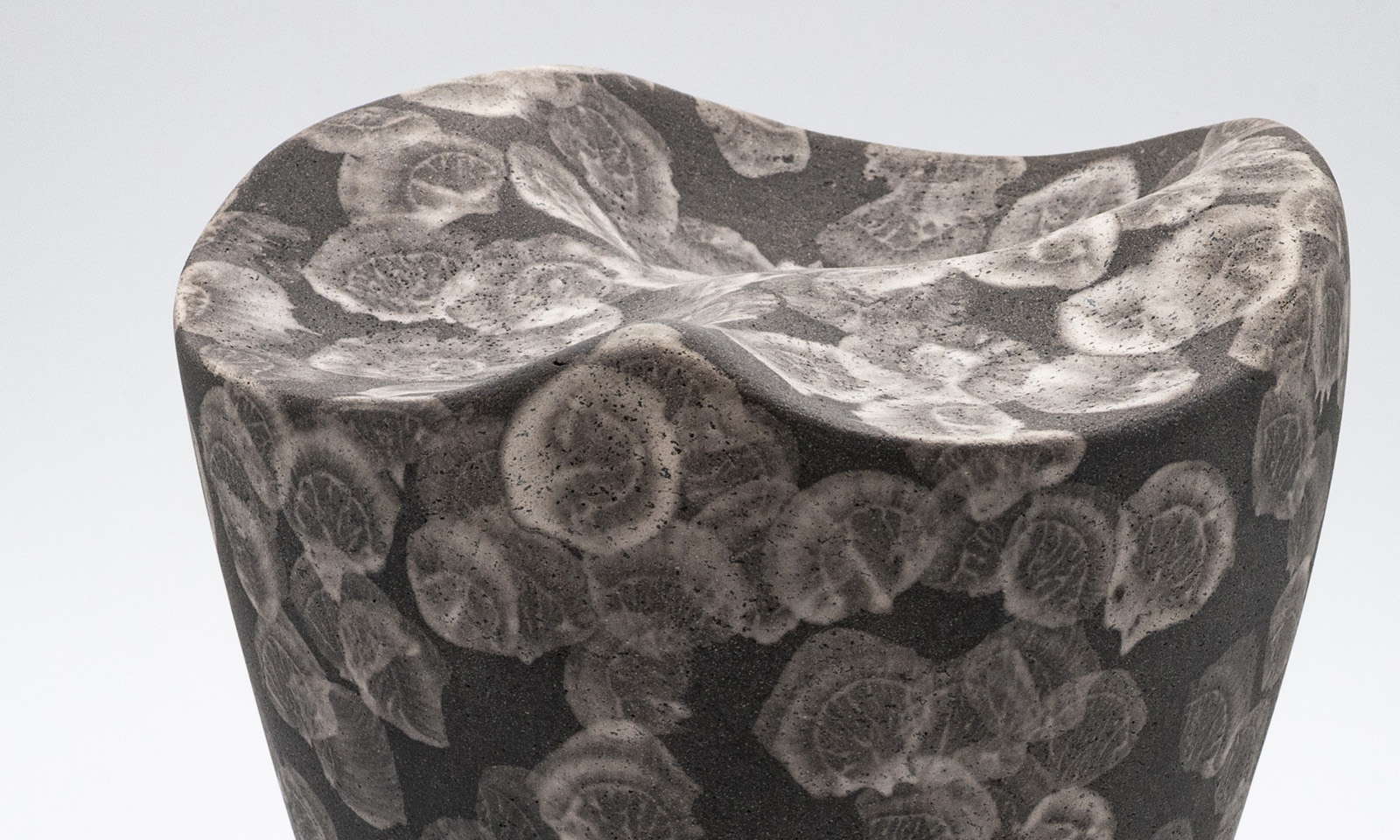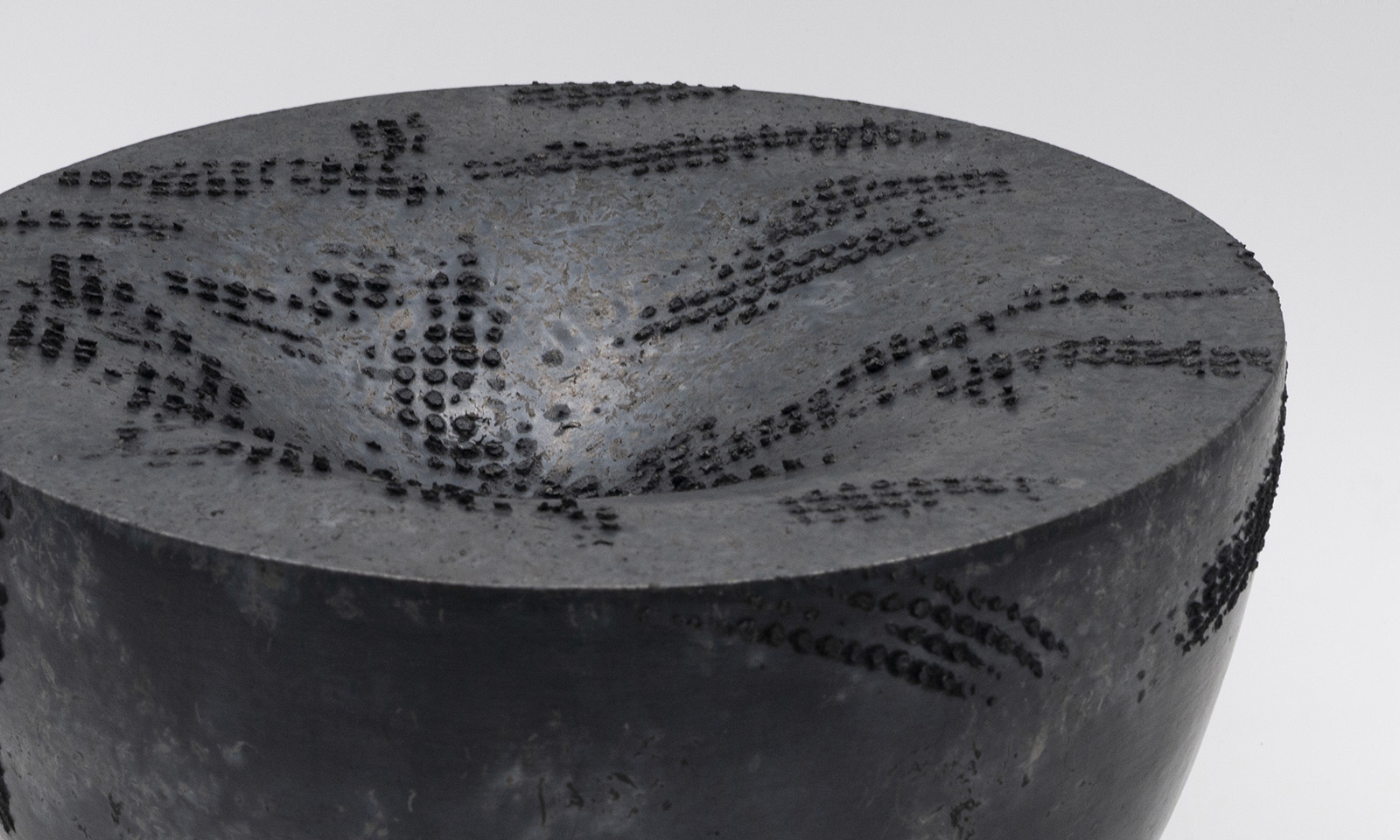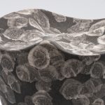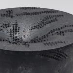 Il fumo che si sviluppa durante la riduzione determina l’aspetto definitivo dei manufatti. Fissandosi sulle aree non mascherate, evoca sfumature cromatiche che variano dal nero intenso al bianco attraverso infinite tonalità di grigio. Si tratta della tecnica naked raku, in cui la rimozione finale delle mascherature rivela il volto ultimo di un’astrazione geometrica formale ed epidermica, al contempo aliena e familiare che richiama memorie archetipiche di culture antiche e lontane.