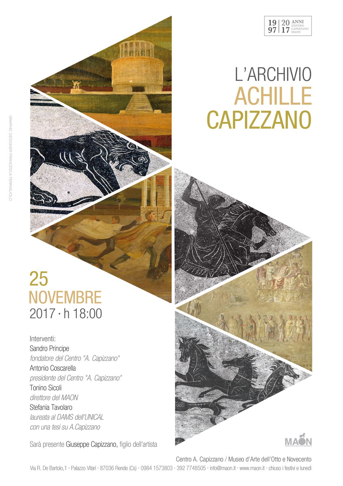 Al MAON, Museo d’arte dell’Otto e Novecento di Rende (Cosenza), si terrà il 25 novembre alle ore 18 la presentazione dell’ARCHIVIO ACHILLE CAPIZZANO, l’artista rendese a cui è intitolato appunto il Centro “A. Capizzano/MAON”, che ha promosso l’iniziativa assieme al Comune di Rende e al “Centro Aleph” di Lamezia Terme.