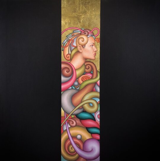 Nelle opere di Fabio Carmignani, l’oscurità occupa uno spazio preponderante che riduce l’aura vitale di una figura che pare “assalita” da mille dubbi. “La coscienza, rappresentata dall’oro e dalla luce – scrive Maurizio Vanni –, seppur apparentemente salvifica, può privare le persone di autenticità. Questo è il dubbio che ci pone Carmignani: dobbiamo scegliere? E in quale modo disciplineremo la nostra scelta? Solo la conoscenza legata al desiderio di crescita permetterà di non “soffrire” la distanza tra luce e ombra”.